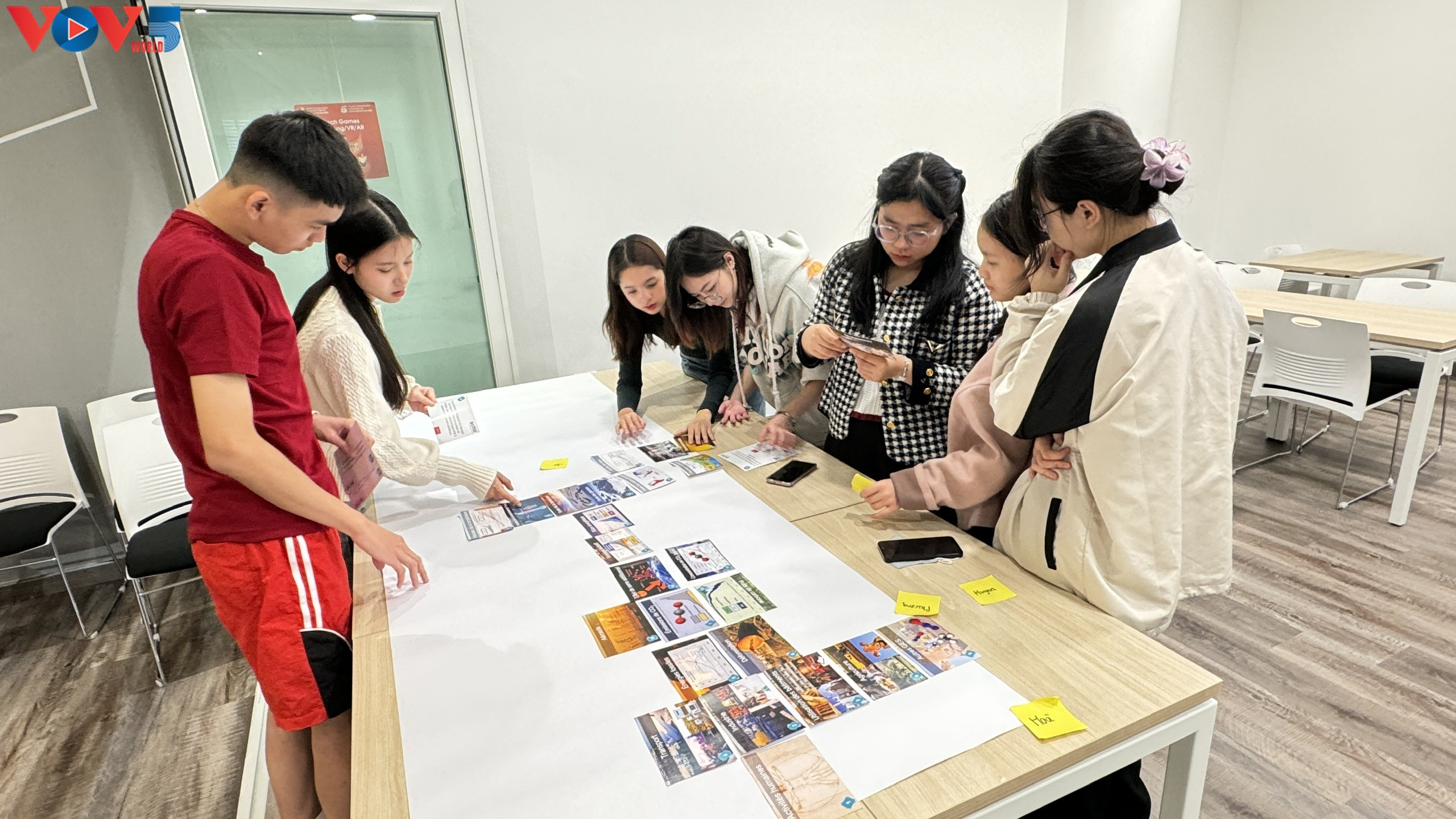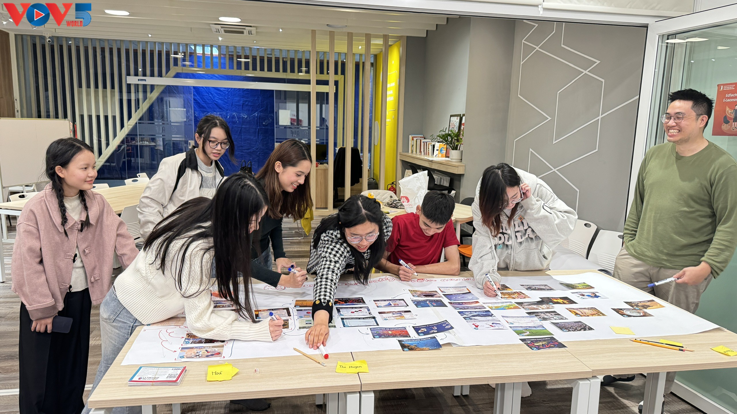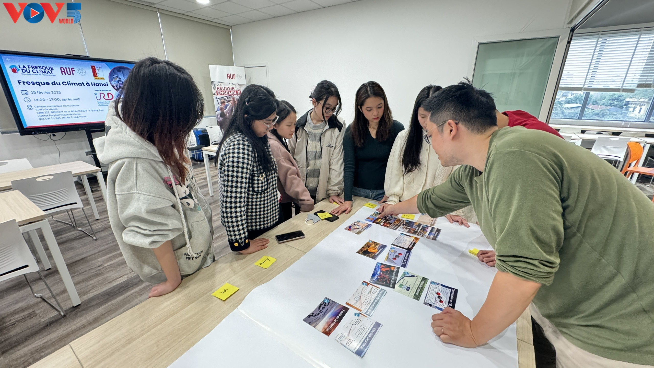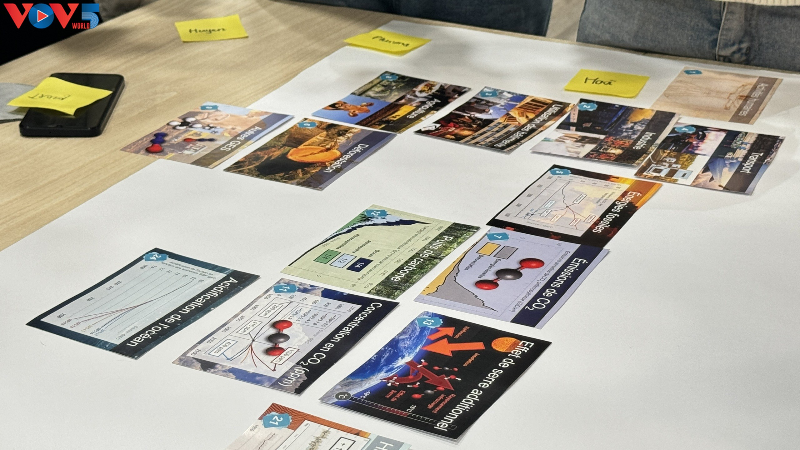 Sous la guidance de Quang-Trân DAO, coordonnateur et formateur de la Fresque du Climat, un outil pédagogique sur le changement climatique, un groupe d’une dizaine de jeunes francophones a été invité à disposer des cartes.