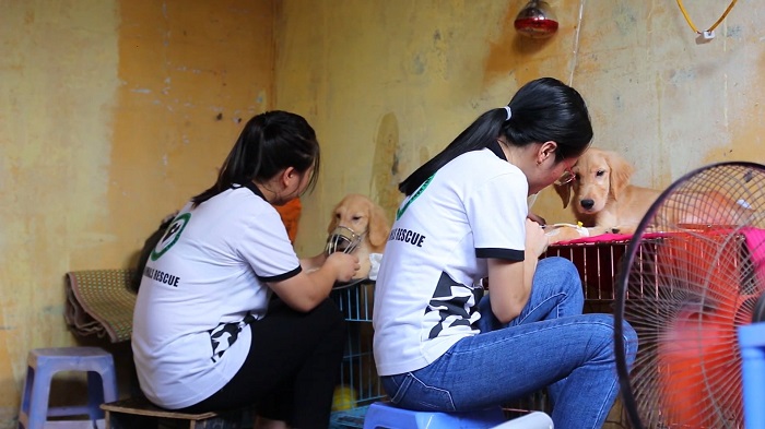 Aujourd’hui, Trang et les vingt-quatre autres membres de la S.P.A s’occupent d’une dizaine de chats et de sept chiens. Quatre parmi eux ont des problèmes dermatologiques alors que six autres ont contracté des maladies transmissibles dangereuses comme la parvovirose canine pour les chiens ou la maladie de Carré pour les chats. Mais il y a également des petites bêtes paralysées, comme le vieux pékinois que tient Nguyên Quang Tuân.