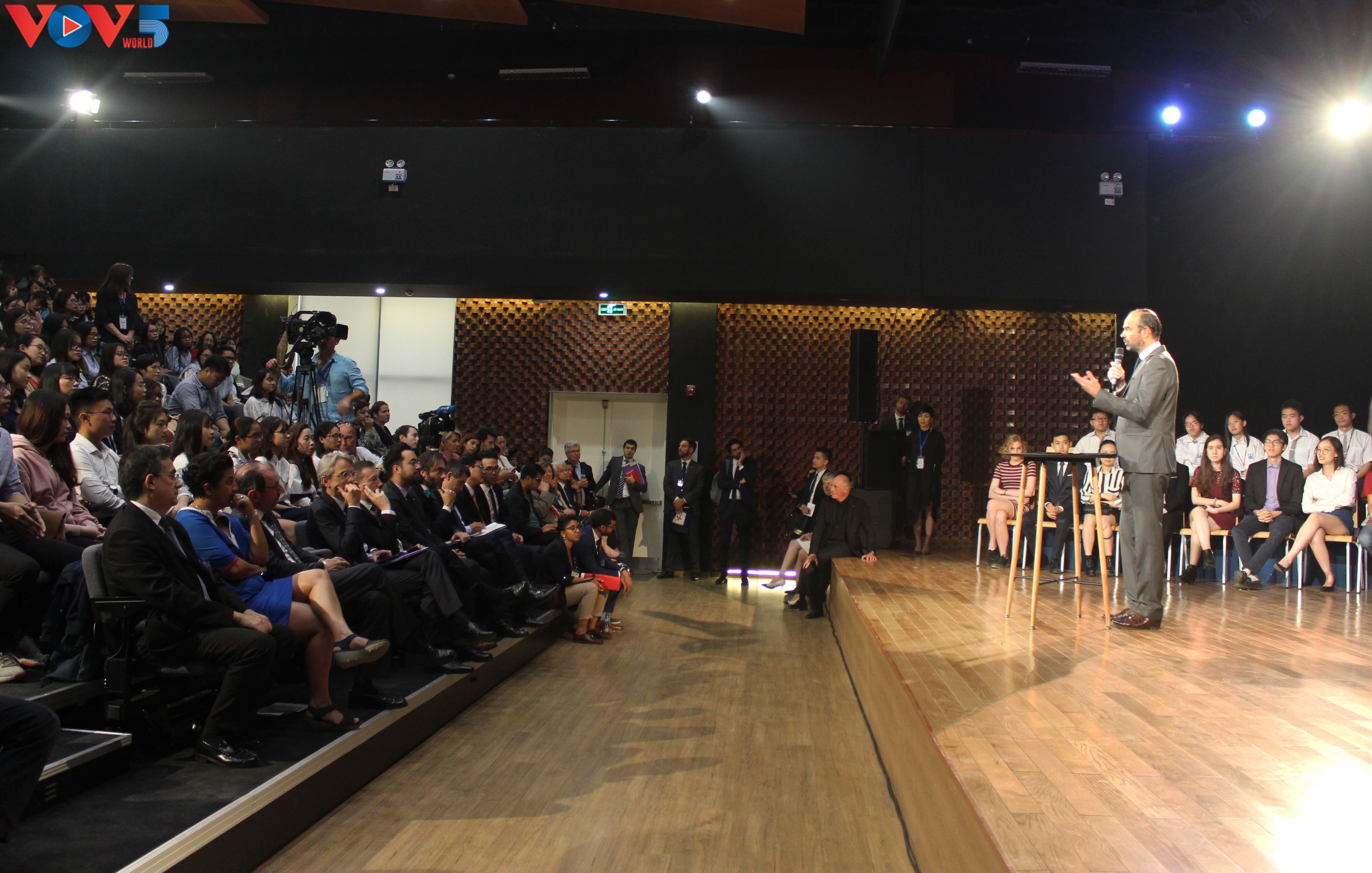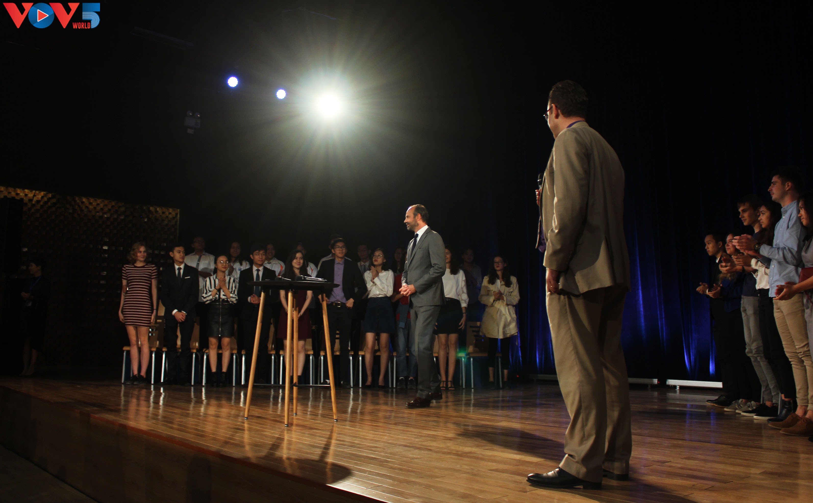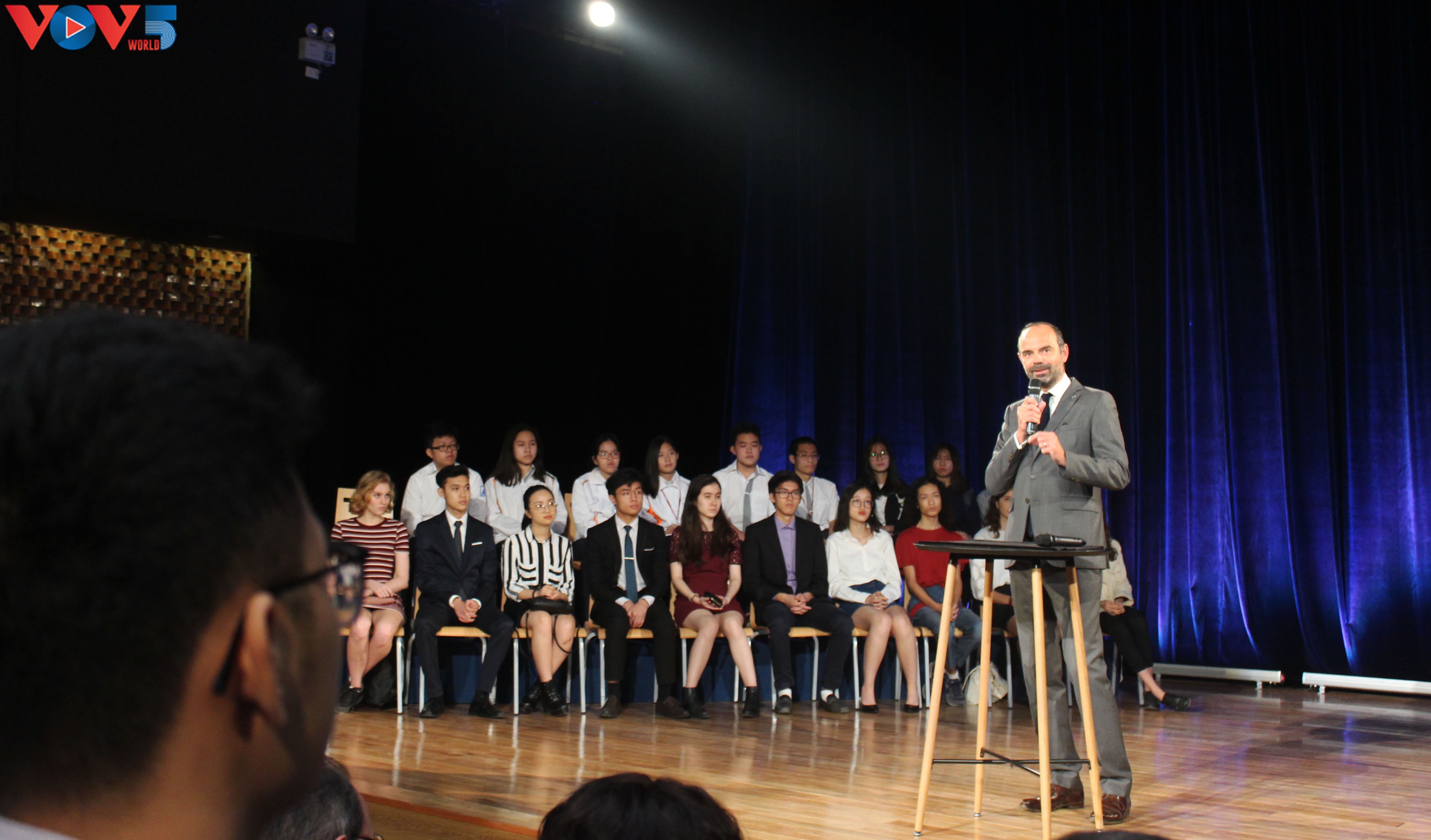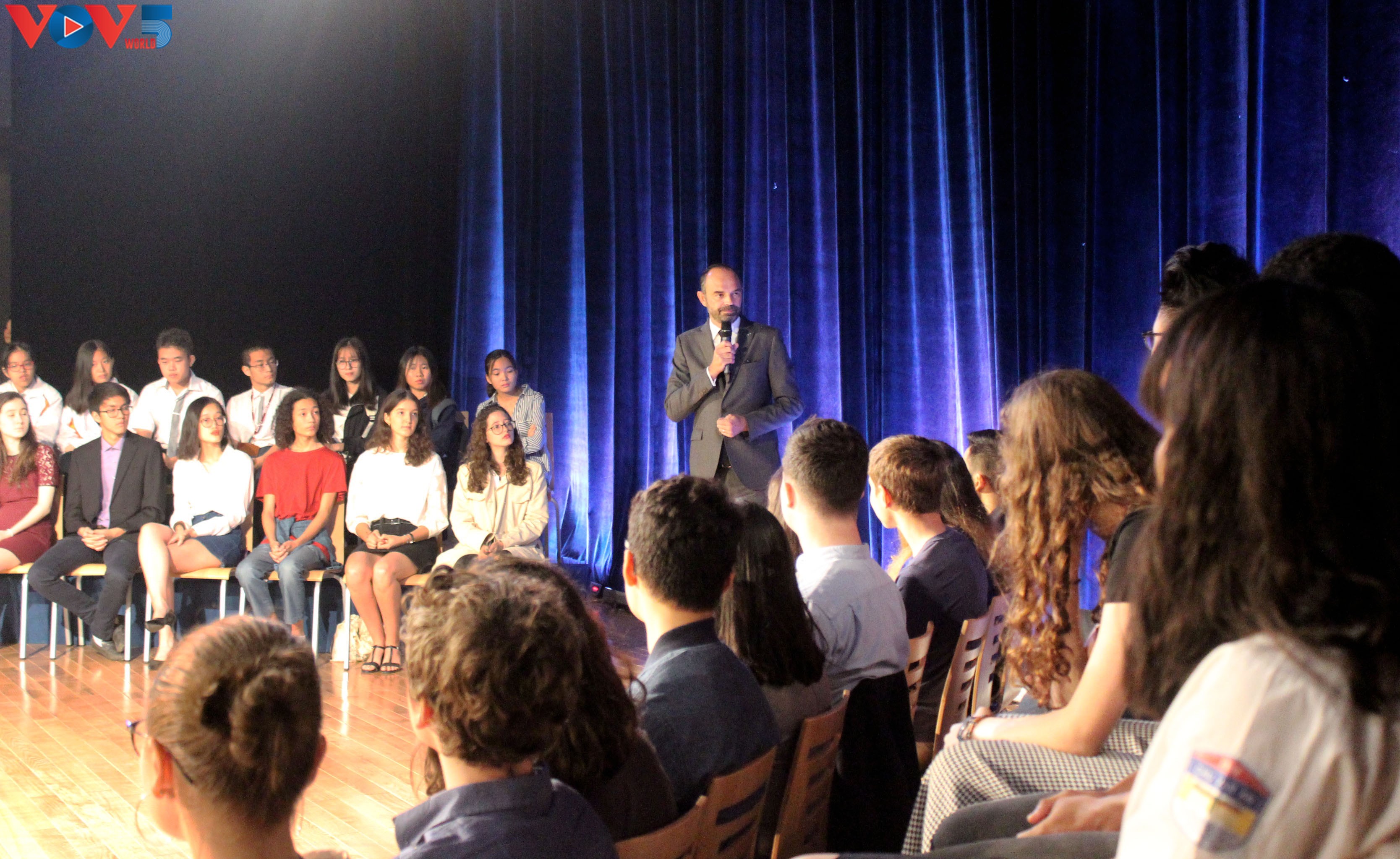 Samedi matin 3 novembre, à l’auditorium du lycée, Édouard Philippe a eu une demie-heure de discussion avec quelques 300 lycéens, étudiants et jeunes actifs vietnamiens et français sur le thème «Comment préparer ensemble les défis de votre génération: innovation, entrepreneuriat, formation».