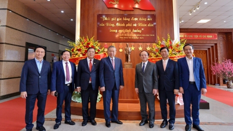 (VOVWORLD) - À l'occasion du Nouvel An lunaire et suite au succès du XIVᵉ Congrès national du Parti, le secrétaire général du Parti communiste vietnamien, Tô Lâm, s’est rendu ce samedi 14 février au siège de la Voix du Vietnam (VOV), à Hanoï, pour présenter ses vœux et encourager les journalistes, techniciens et personnels de la radio nationale.
