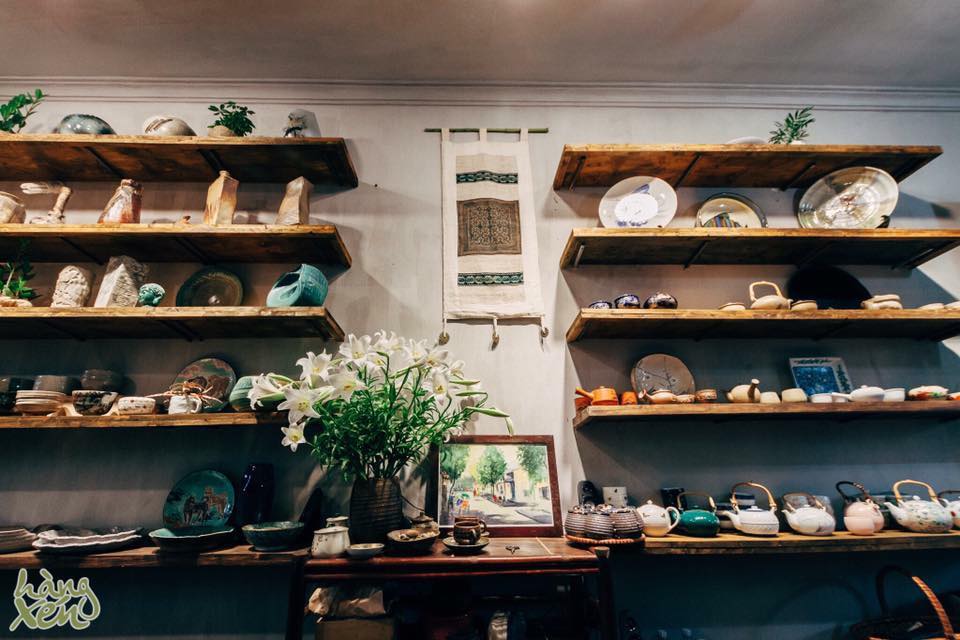 Huyên se livre à son activité préférée, c’est-à-dire fouiller les six étagères remplies de bols, de théières ou de vases pour trouver son coup de cœur du jour. Les objets y sont rangés en fonction de leur prix.