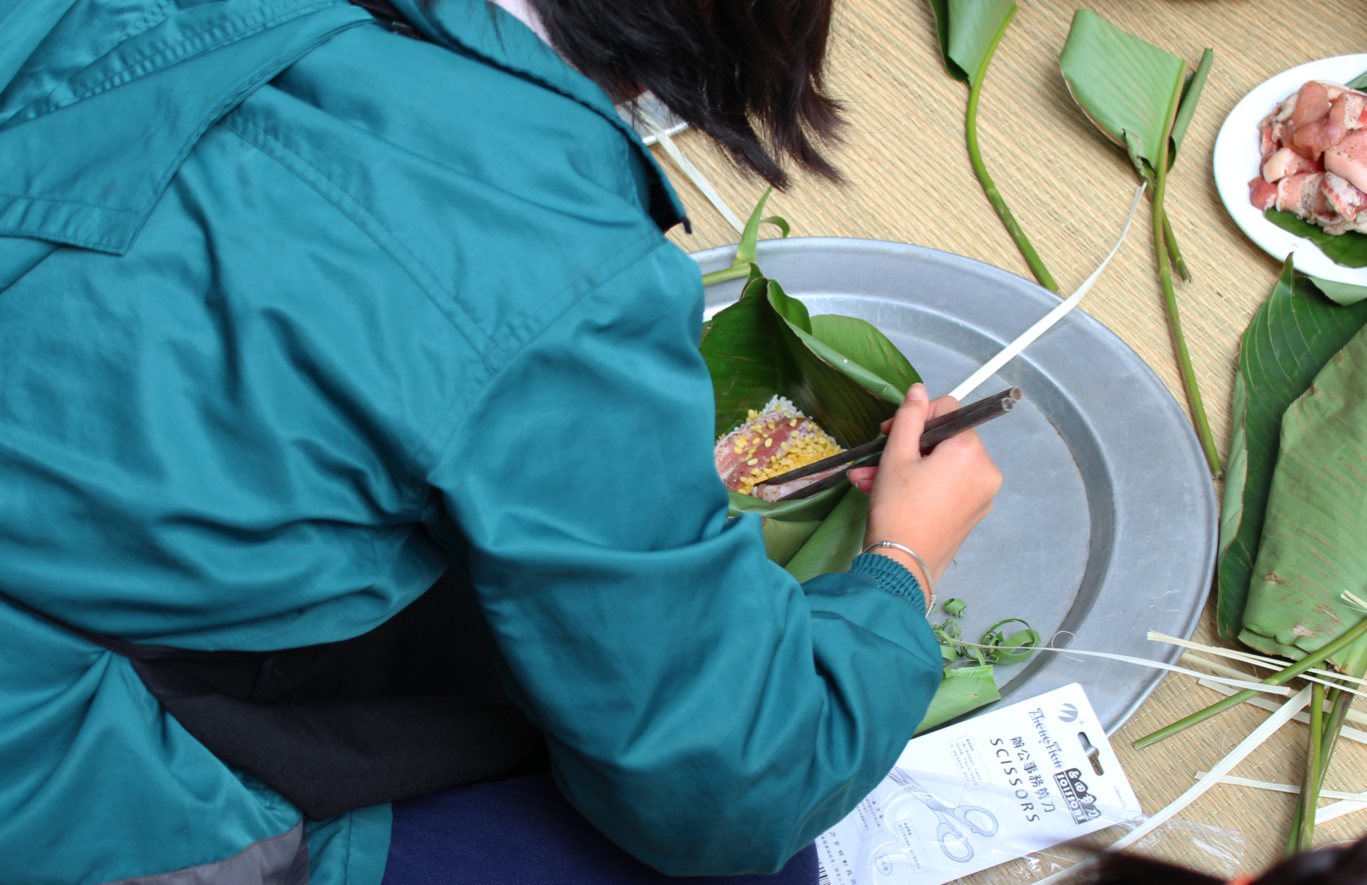 Un peu de riz gluant, un peu de haricot mungo, un morceau de viande de porc aromatisé de poivre noir au milieu. Tous ces ingrédients sont enveloppés dans des feuilles de phrynium... Dit comme ça, évidemment…