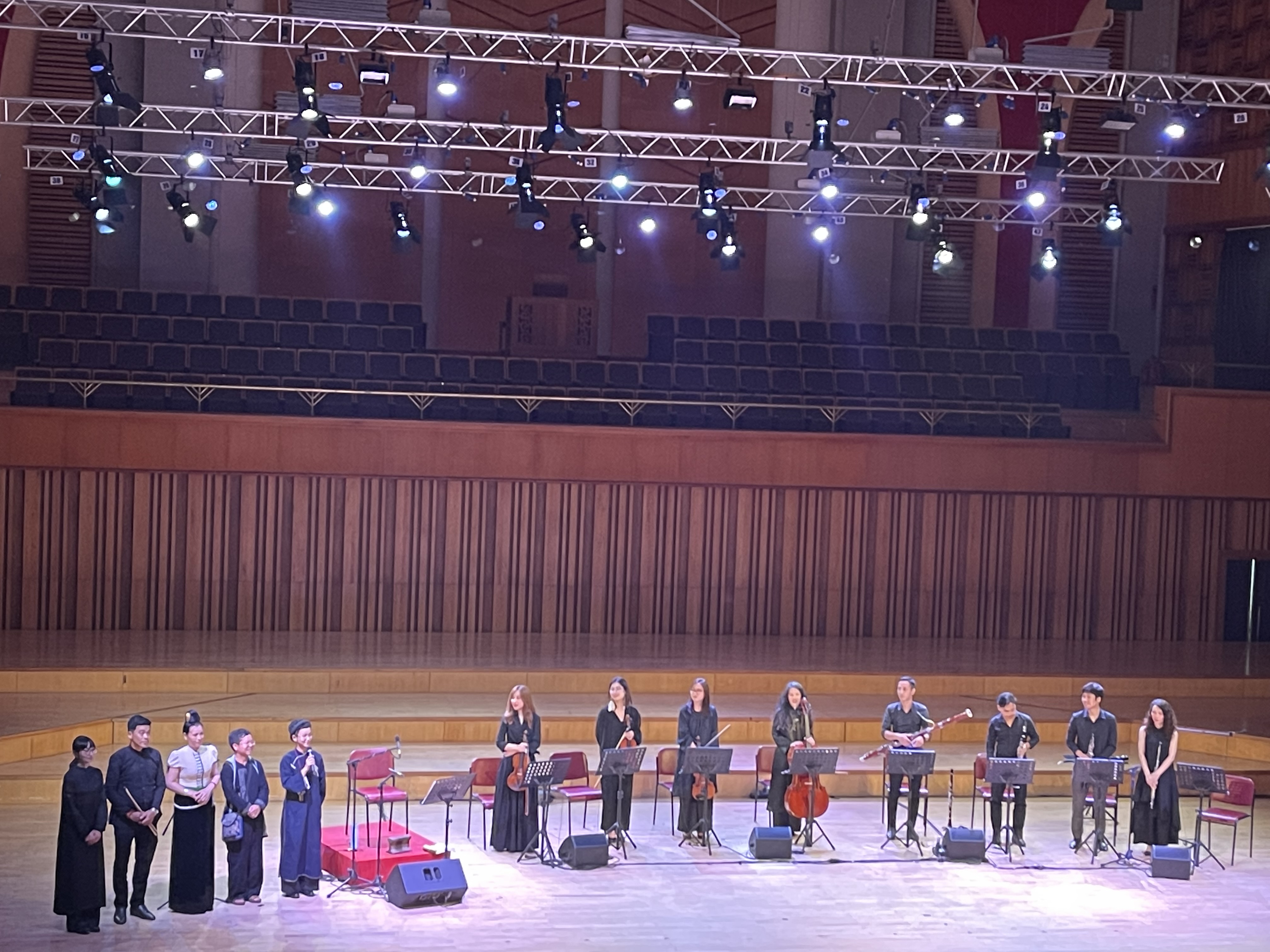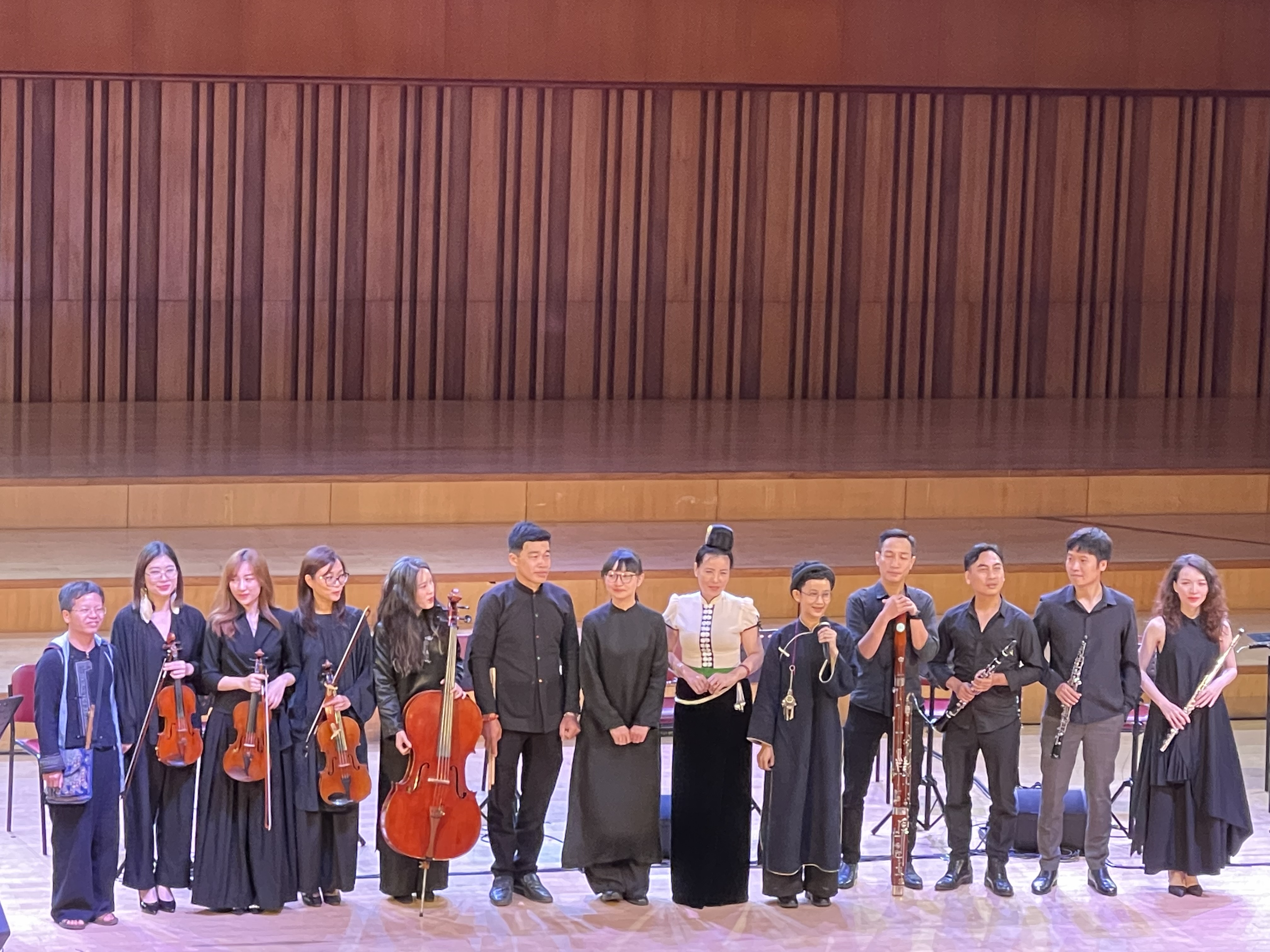 «Je suis très ravi d’être là, de travailler avec Ly, qui est une jeune chanteuse talentueuse et sympathique. J’ai grandi au son des berceuses et des chansons folkloriques Mông, à Sapa, alors je me permets de vous en chanter une. Mais ne vous endormez pas, s’il vous plaît!», plaisante-il en guise d’introduction à Ru Con.