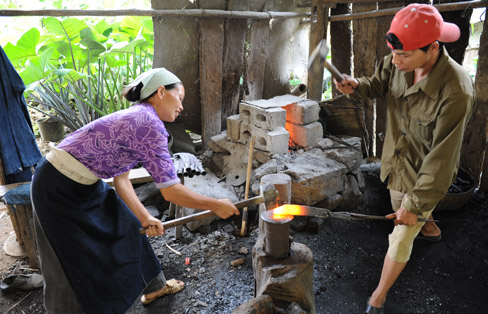 Nous voici dans le village de Phuc Sen, dont tous les habitants sont des Nungs. Sa particularité : la forge traditionnelle. « Ce village reste peu développé, indique Ngoc Anh. Les autochtones portent encore leurs costumes traditionnels indigos. La teinture de ces vêtements, complètement artisanale, prend plusieurs jours. Ce village est surtout connu pour sa forge de couteaux. Les couteaux fabriqués par les villageois de Phuc Sen sont souvent bien meilleurs que ceux faits ailleurs ».