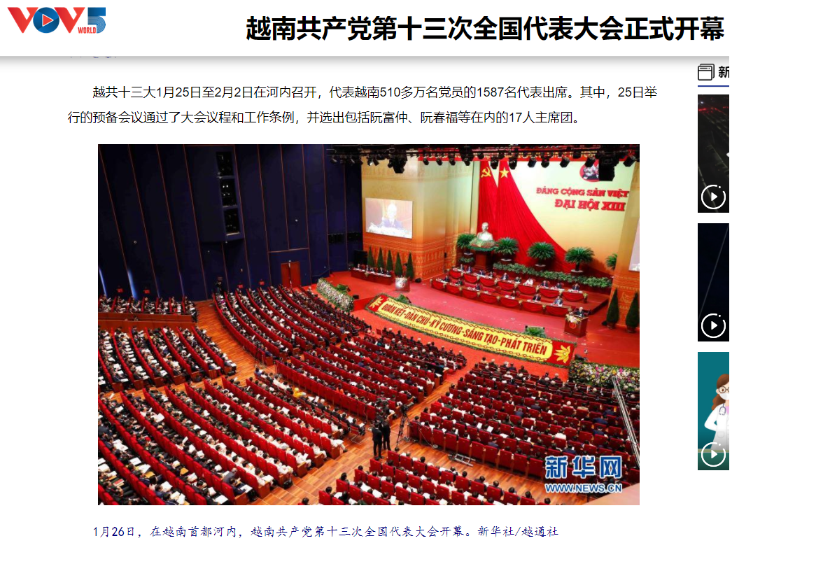 Koran “Renmin Ribao” (atau Harian Rakyat) mengutip Laporan politik yang disampaikan Sekretaris Jenderal Komite Sentral Partai Komunis Vietnam (Sekjen KS PKV), Presiden Nguyen Phu Trong yang menegaskan bahwa target umum PKV ialah: meningkatkan kemampuan memimpin, kemampuan memegang kekuasaan dan daya juang dari PKV; membangun PKV dan sistem politik yang jernih, kuat, komprehensif; memperkokoh dan memperkuat kepercayaan rakyat terhadap PKV, Negara, sistem sosialisme; mempertahankan secara mantap lingkungan damai dan stabil; berupaya sampai pertengahan abad XXI menjadi negara maju. Selain itu, koran ini juga memuat secara lengkap isi telegram ucapan selamat dari Partai Komunis Tiongkok kepada Kongres Nasional XIII PKV.