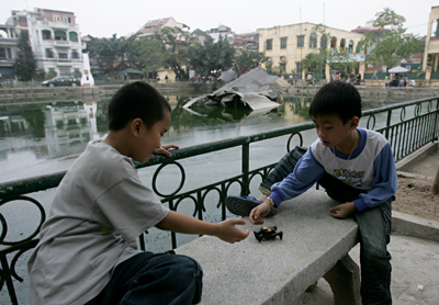 Anak-anak bermain di samping bangkai pesawat terbang B.52 yang ditembak jatuh di Danau Huu Tiep, Desa Ngoc Ha, kota Hanoi
