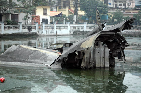 Sebagian dari bangkai pesawat terbang B.52 telah ditembak jatuh oleh prajurit penangkis udara angkatan udara Vietnam di Danau Huu Tiep di desa bunga Ngoc Ha, kota Hanoi