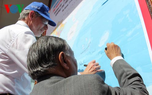 Para sarjana asing membubuhkan tanda tangan pada peta Vietnam