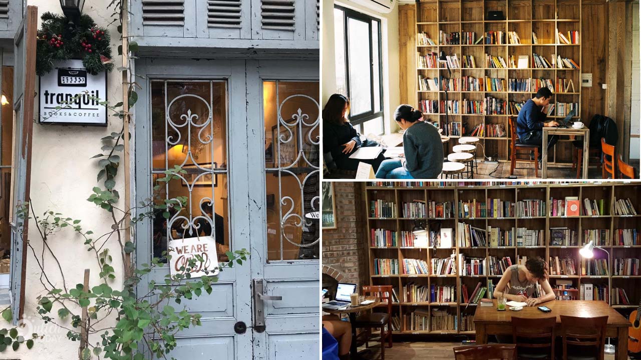 Pertama, marilah kita kunjungi Tranquil Books & Café. Terletak di ujung gang kecil di jantung ibu kota, Tranquil Books & Café adalah kafe pustaka terkenal di Kota Hanoi, paling banyak dikunjungi karena bernuansa tenang.