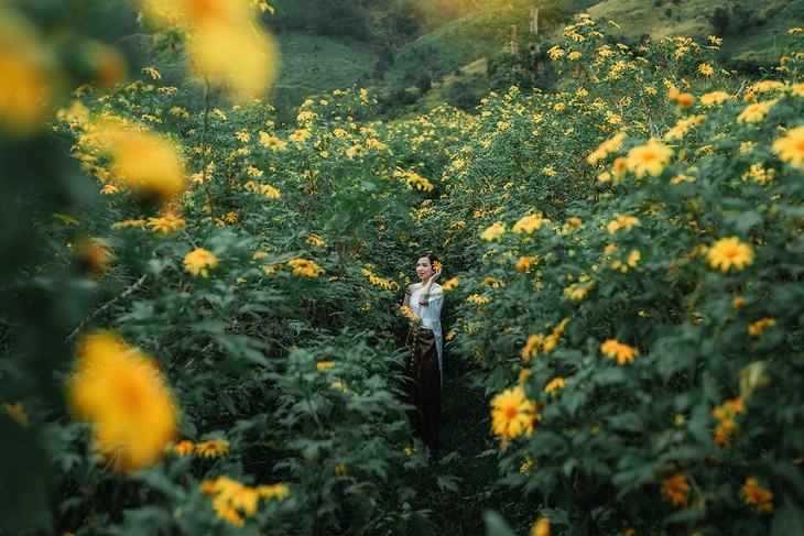 Di musim ini, warna kuning bunga kipait bercampur dengan hijaunya ladang-ladang menciptakan keindahan yang menarik di daerah dataran tinggi. Foto: Tan Kan/thanhnien.vn