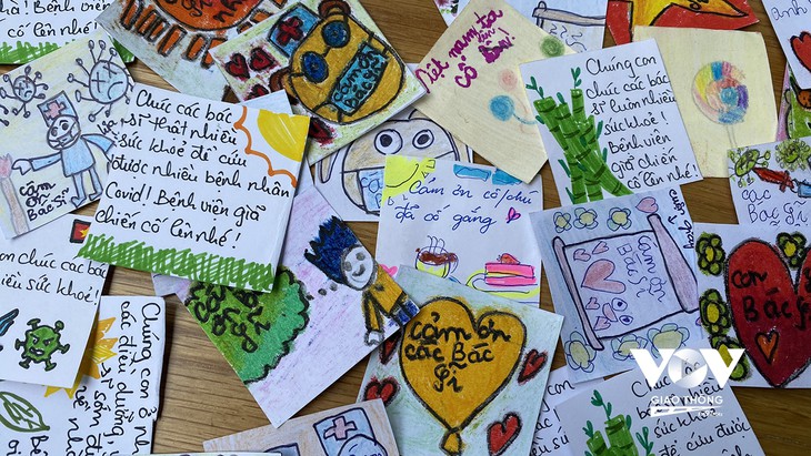 | Di Gedung B, Apartemen Binh Khanh, Kecamatan An Phu, Kota Thu Duc, ketika orang tua dengan susah payah siang malam mempersiapkan 200 porsi makanan gratis untuk menambah tenaga kepada berbagai rumah sakit lapangan, anak-anak juga ingin menyemangati para nakes dan orang-orang lain di garis depan melawan wabah dengan mengirimkan pesan kasih sayang |