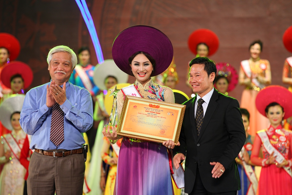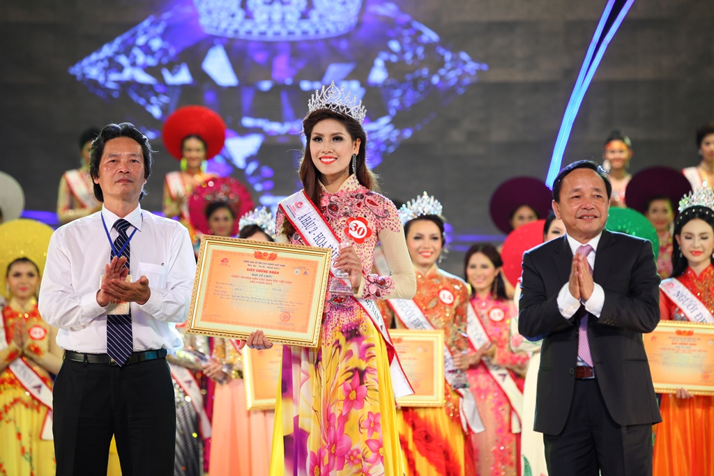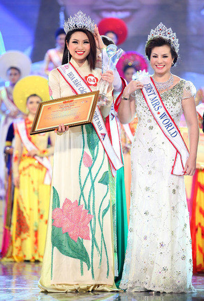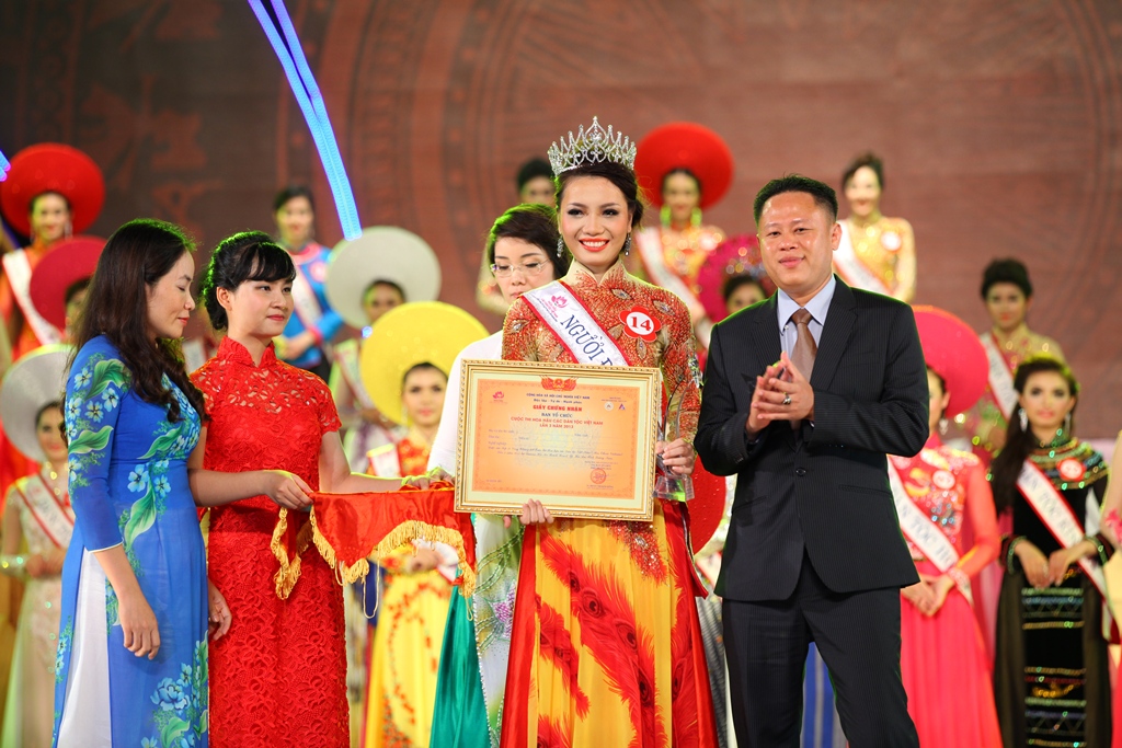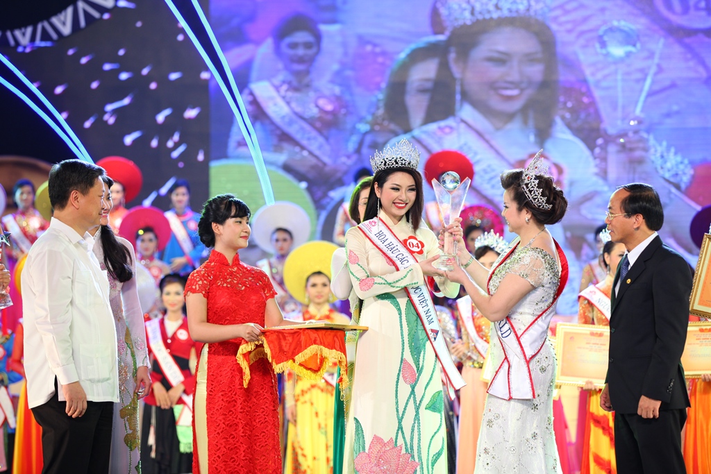 | Ibu Doan Thi Kim Hong, Wakil Kepala Panitia Penyelenggara kontes menyampaikan mahkota dan piala kepada Nguyen Thi Ngoc Anh |
