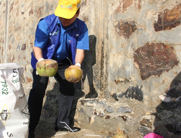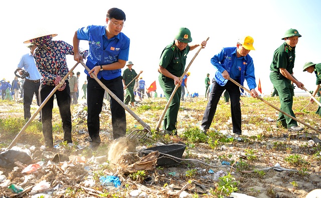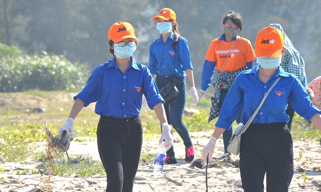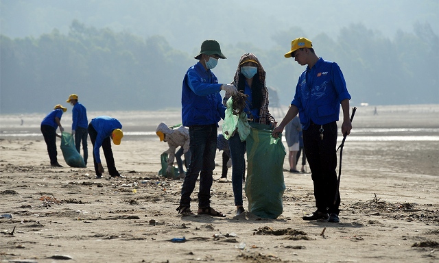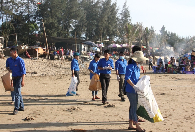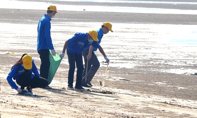 Walaupun cuacanya panas, tapi para pemuda sukarela tetap ikut membersihkan sampah di pantai Sam Son, provinsi Thanh Hoa