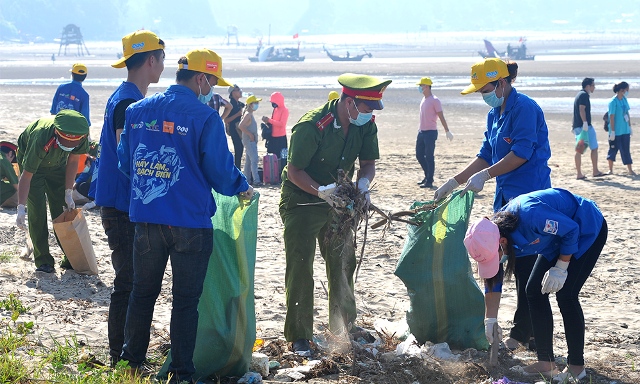 Para personil polisi juga ikut menyambut membersihkan pantai Sam Son