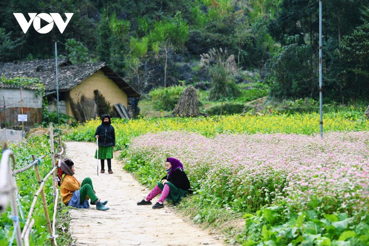 Daerah Dataran Tingi Karst Dong Van, di Provinsi Ha Giang sangat megah, tetapi juga sangat lembut dan anggun berkat warna bunga-bunga . Di awal musim dingin, pegunungan di sana tampaknya dikenakan baju baru, ditenun oleh warna ungu, putih, dan merah muda yang penuh pesona dari bunga gandum kuda.