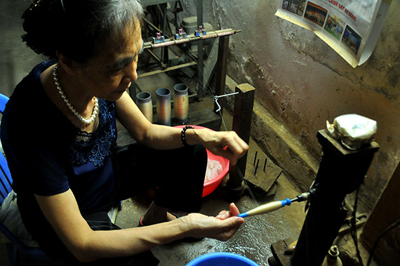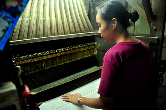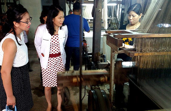 Para wisatawan mengunjungi pabrik produksi seniman Trieu Van Mao, orang yang berjasamemulihkan 21 jenis sutra kuno yang telah ditinggalkan dari hari ke hari.