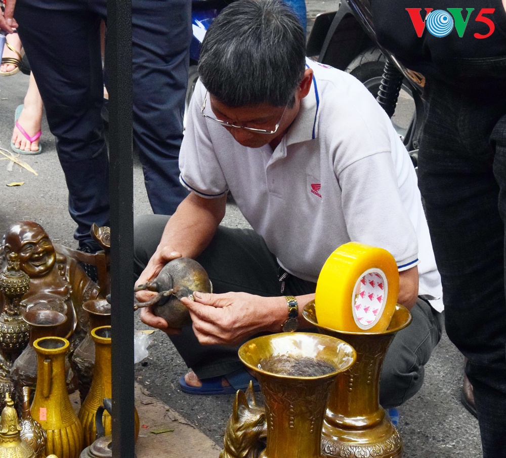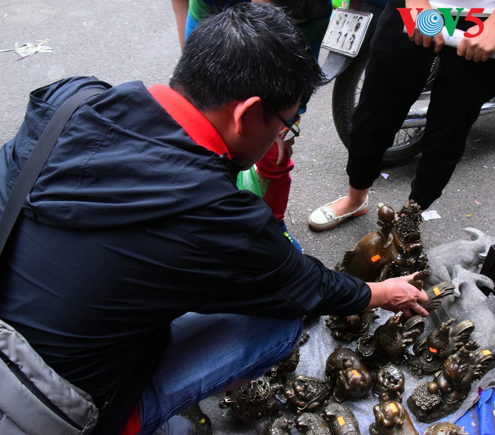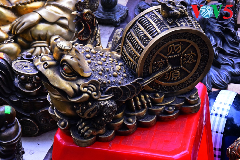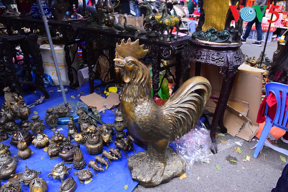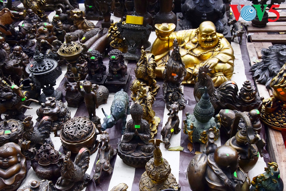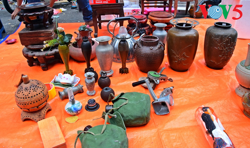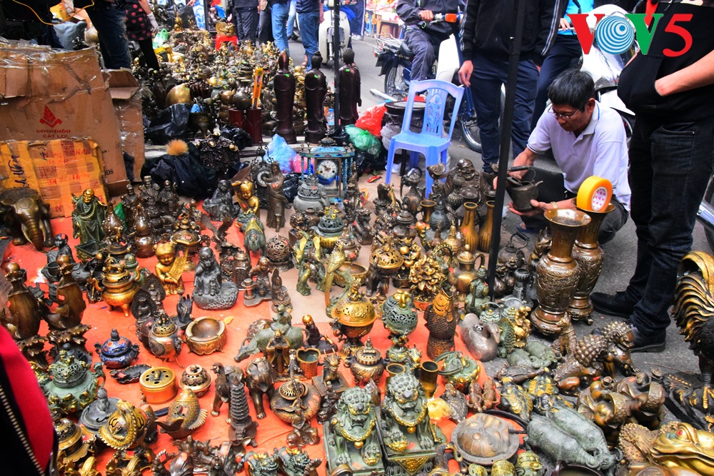 | Barang antik cukup bermacam-macam jenis, dari vas bunga, patung Phuc, Loc dan Tho ( yaitu Kebahagiaan, Rezeki dan Panjang Umur), piring antik dan lain-lain....yang dipajang di pasaran ini.. |