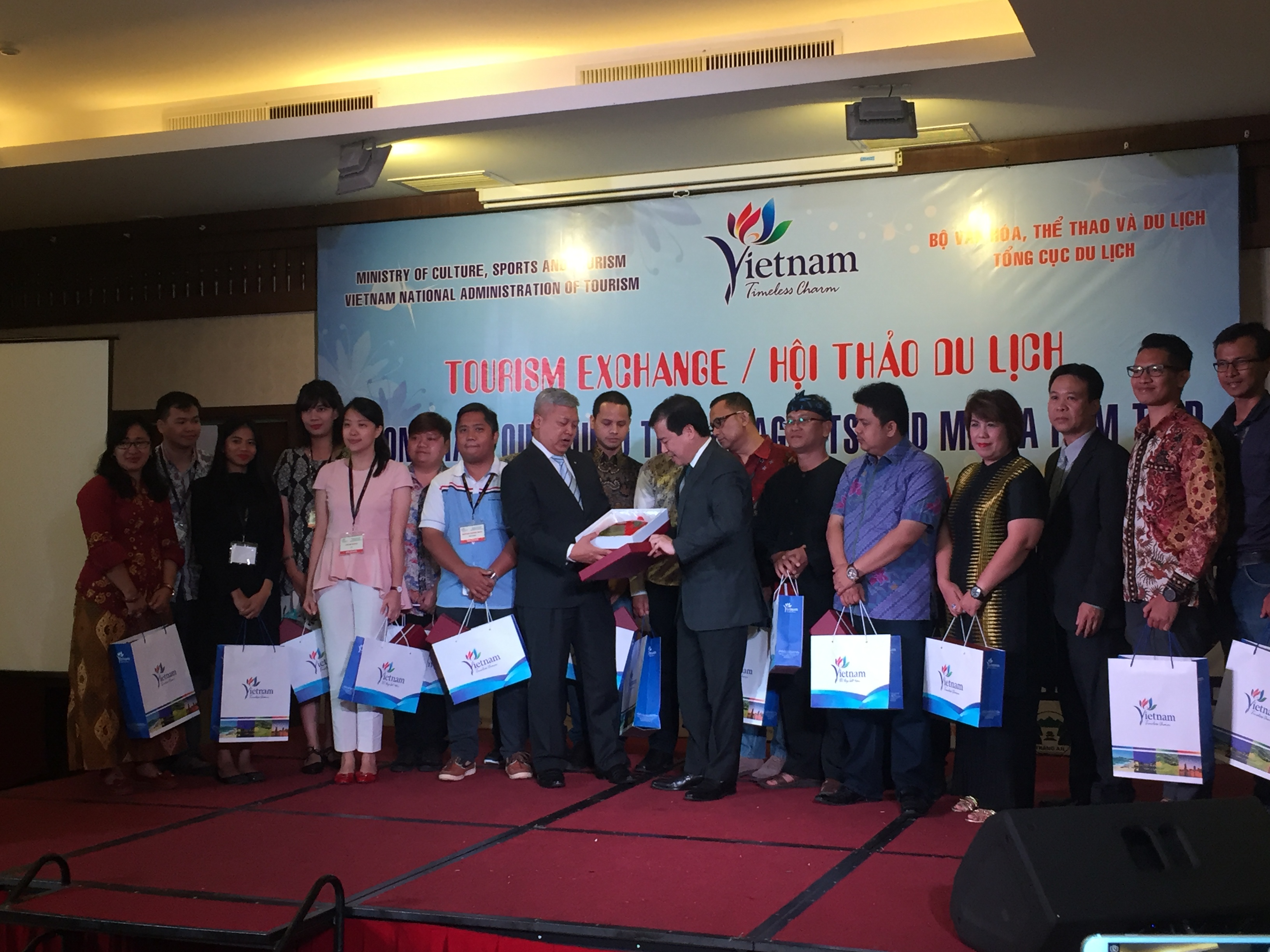 | Wakil Direktor Jenderal Pariwisata Vietnam menyampaikan hadiah kepada para peserta Famtrip kali ini dan Duta Besar Indonesia untuk Vietnam, Ibnu Hadi. Ini merupakan kesempatan yang baik untuk meningkatkan kerjasama pariwisata antara Vietnam dan Indonesia. |