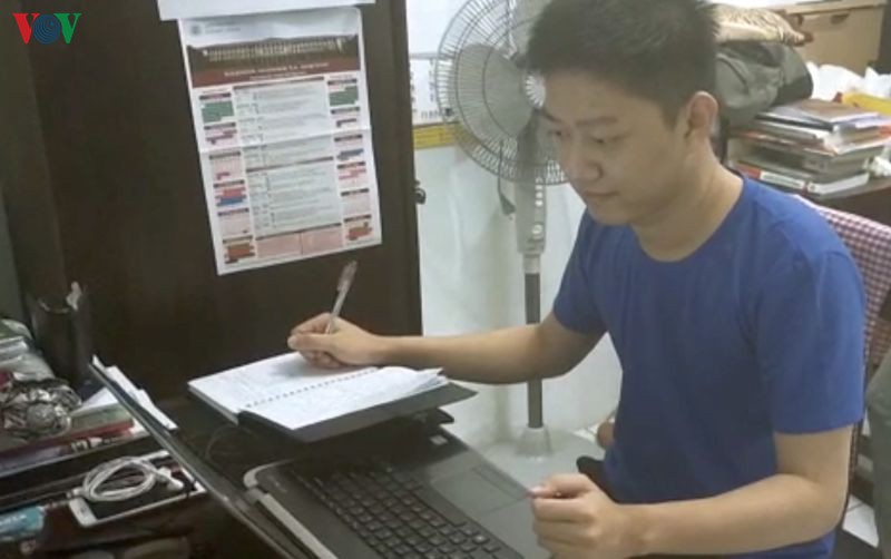 Nguyen Hoang Quy mendengarkan pengajaran-pengajaran online