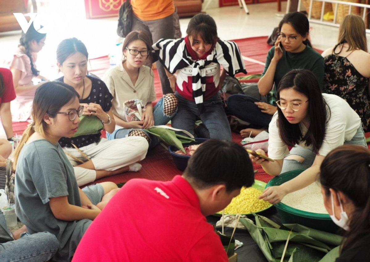Pusat Bahasa dan Ilmu Pengetahuan Tentang Vietnam di Bangkok menyelenggarakan kegiatan masyarakat membungkus Kue Chung (Foto : VOV)