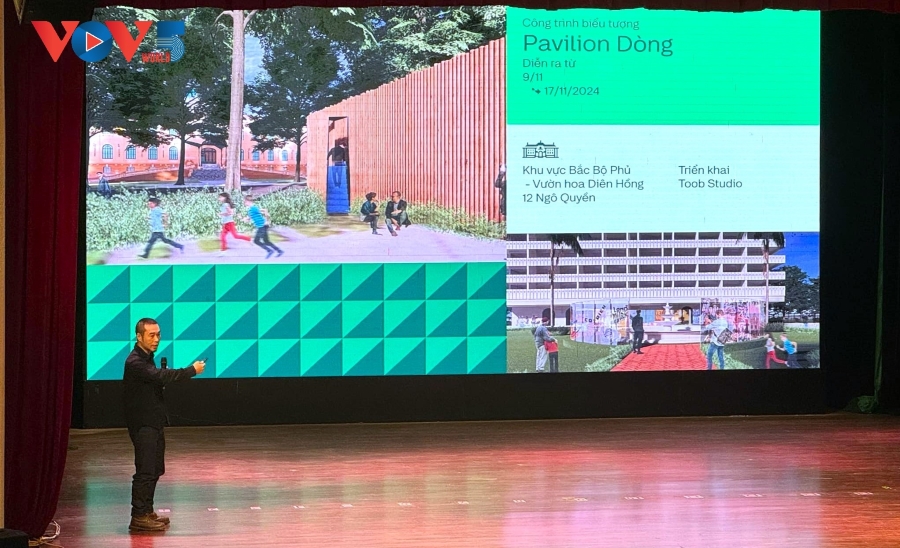 Nguyen Hong Quang, Kepala Arsitek Festival berbagi tentang kelompok bangunan warisan budaya utama di Festival tahun ini. (Foto: Thuy Tien/VOV) |