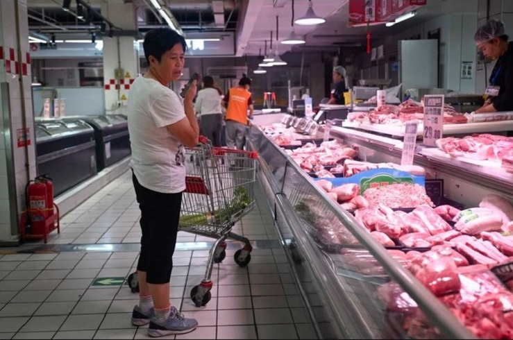 Seorang konsumen di depan tempat jual daging babgi di Tiongkok (Foto: AFP) |