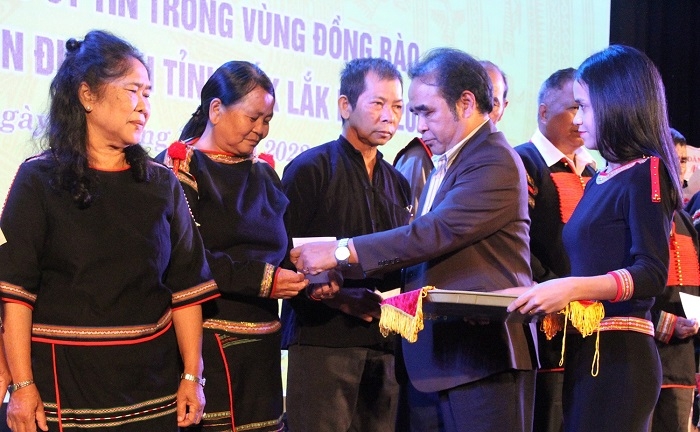 Ibu H'Yao Knul - Ketua Komite Etnis Minoritas Provinsi Dak Lak memberikan surat pujian kepada Bapak Y-Dheh Ayun. (Foto: VOV) |