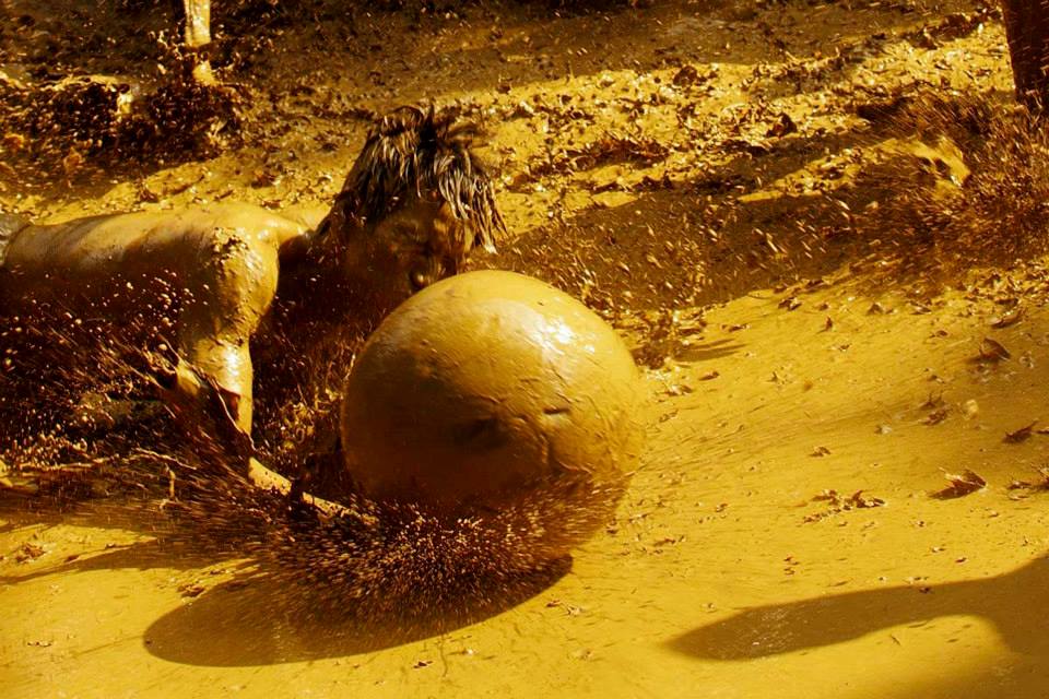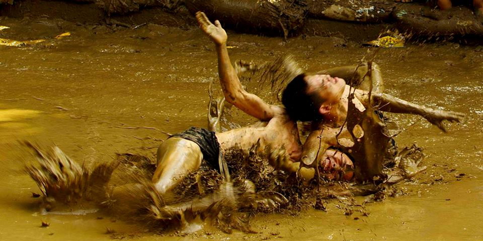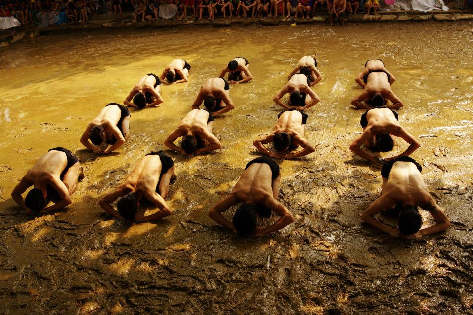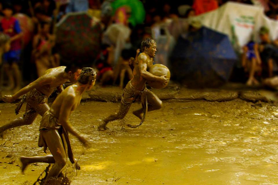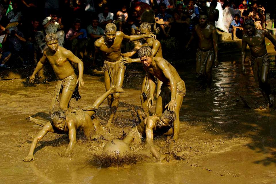 ![]() Senior villagers organize the game on the ground in front of the gods’ temple during the rainy season in the abundant mud puddles. |