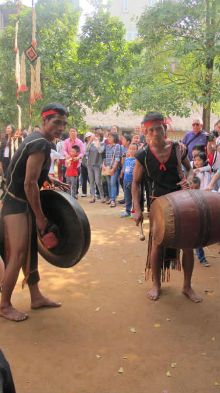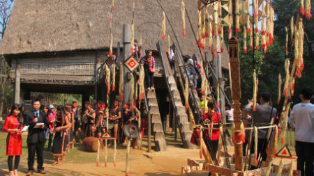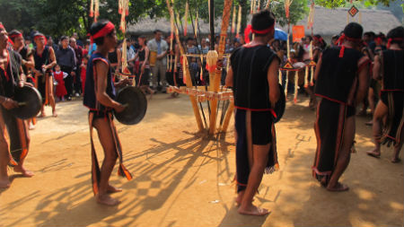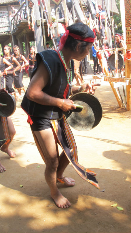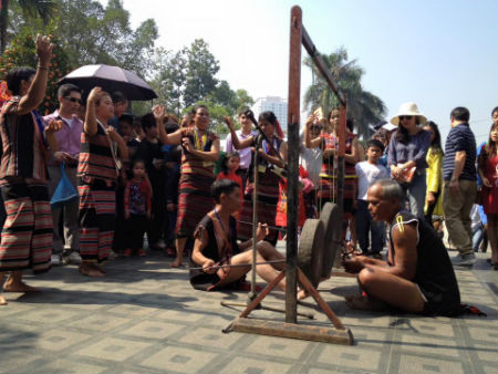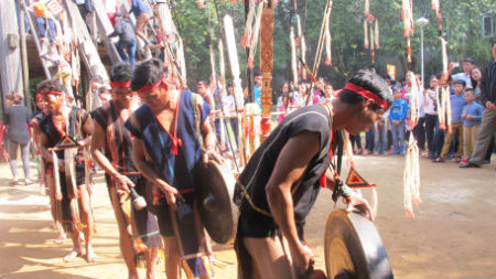 (VOVworld) – Gong performances by a Bahnar gong team from the province of Kon Tum charmed audiences in Hanoi at a New Year program held by the Vietnam Museum of Ethnology. Gongs are often played during festivals and ceremonies of the Bahnar, when people eat traditional food, drink wine and play gongs. Gongs are played in an orchestra. Bahnar men and women wear traditional clothes and dance in a circle around a traditional Neu tree. A performance normally includes about 25 people. The women dance, but do not play gongs. Gongs vary in size and weight. 3 big gongs and 10 cymbals are involved in each performance. The gong dance takes place in front of the Bahnar communal house, which is also called a Rong stilt house.