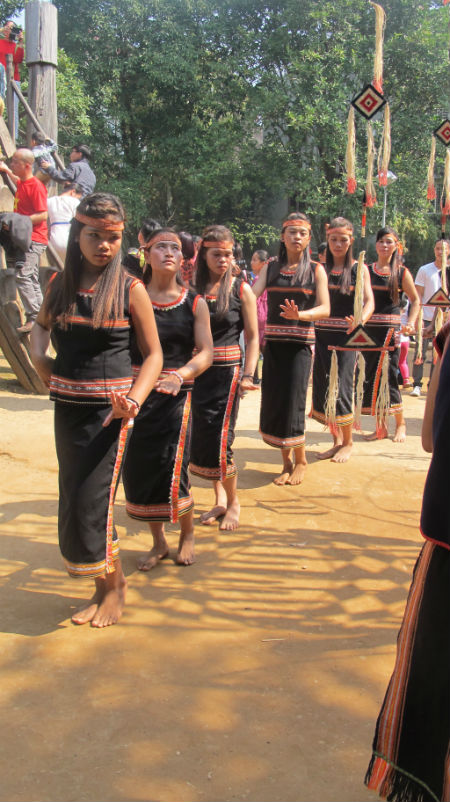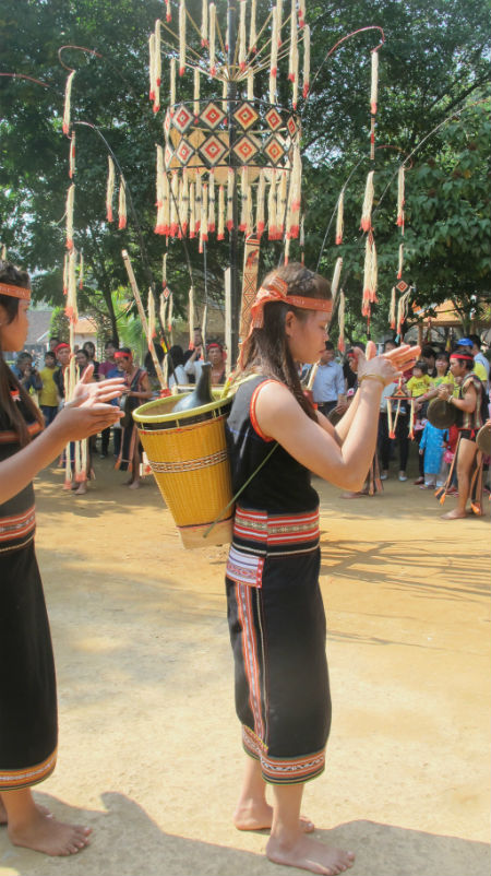 | Normally, Bahnar women do not play gongs and chiengs. They only imitate the motions of farm work such as harvesting. |