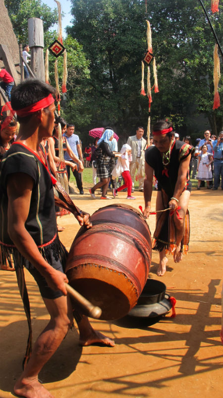 | Bahnar men recreate the “Buffalo sacrifice” performance, which is held on many occasions, including the celebrations of victory. |