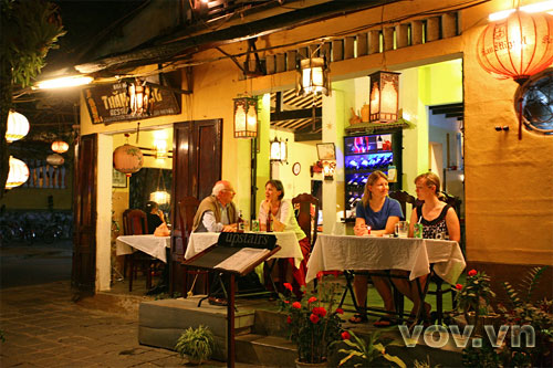 | Street restaurants under An Hoi bridge are lit up |