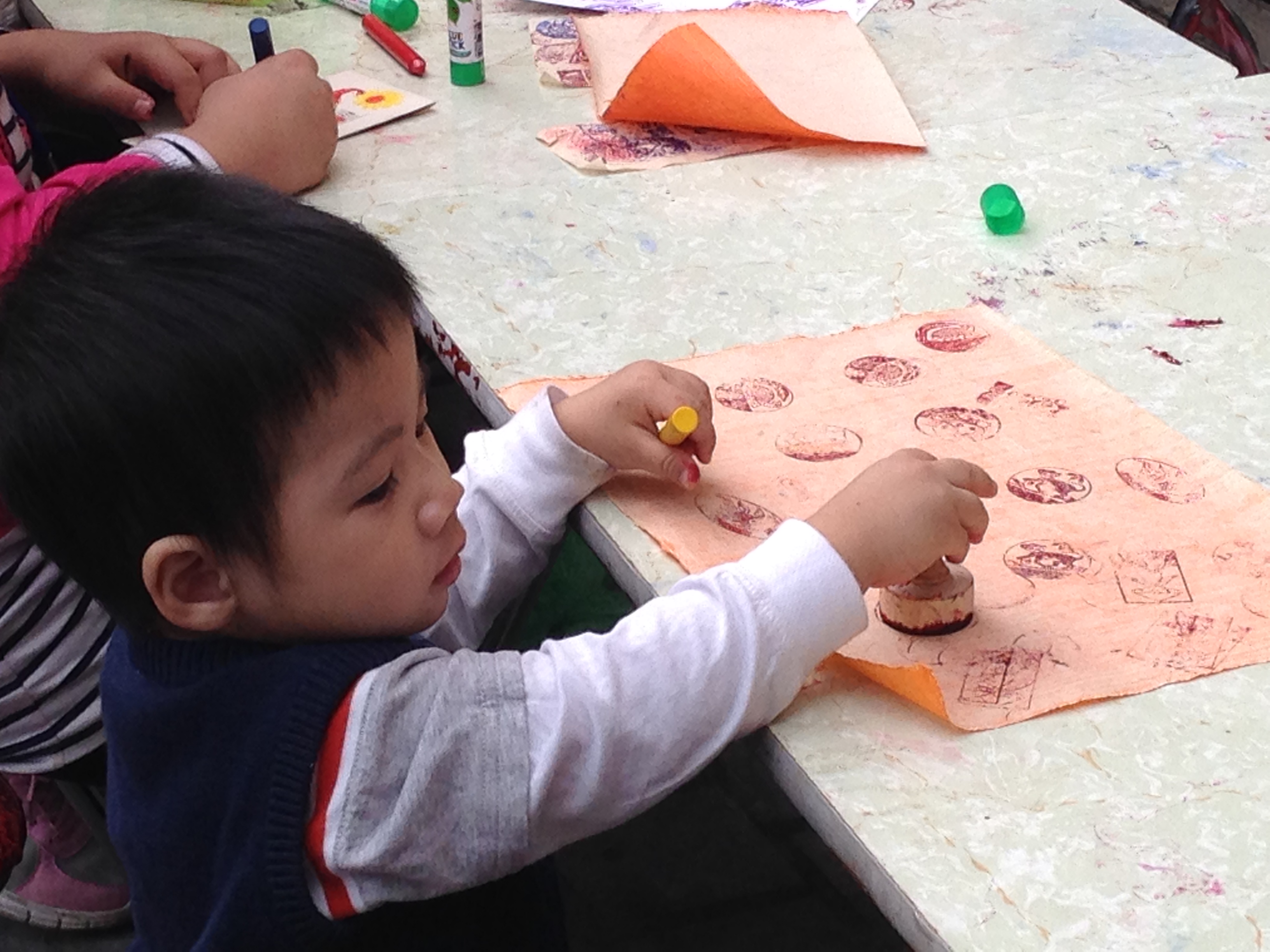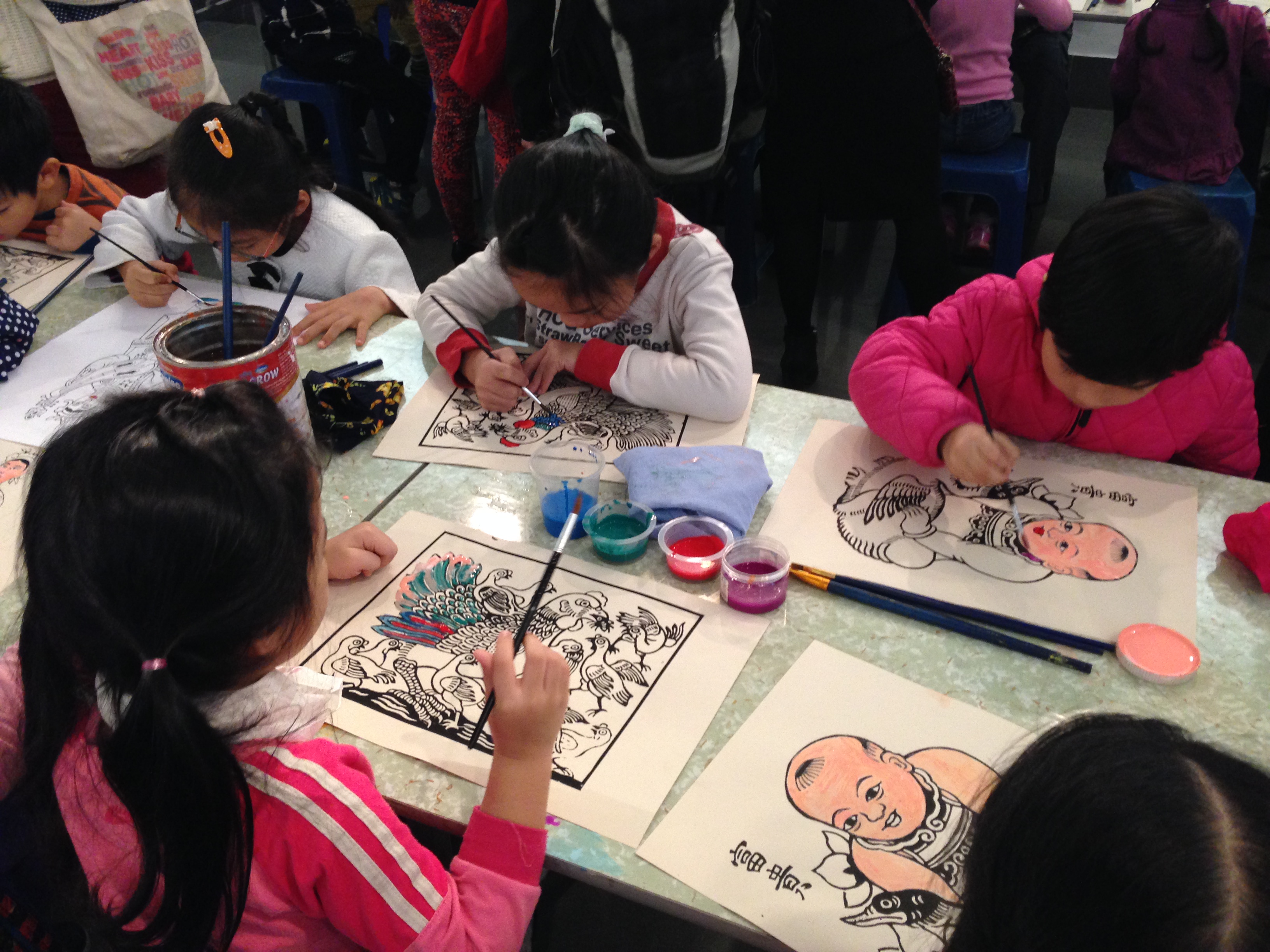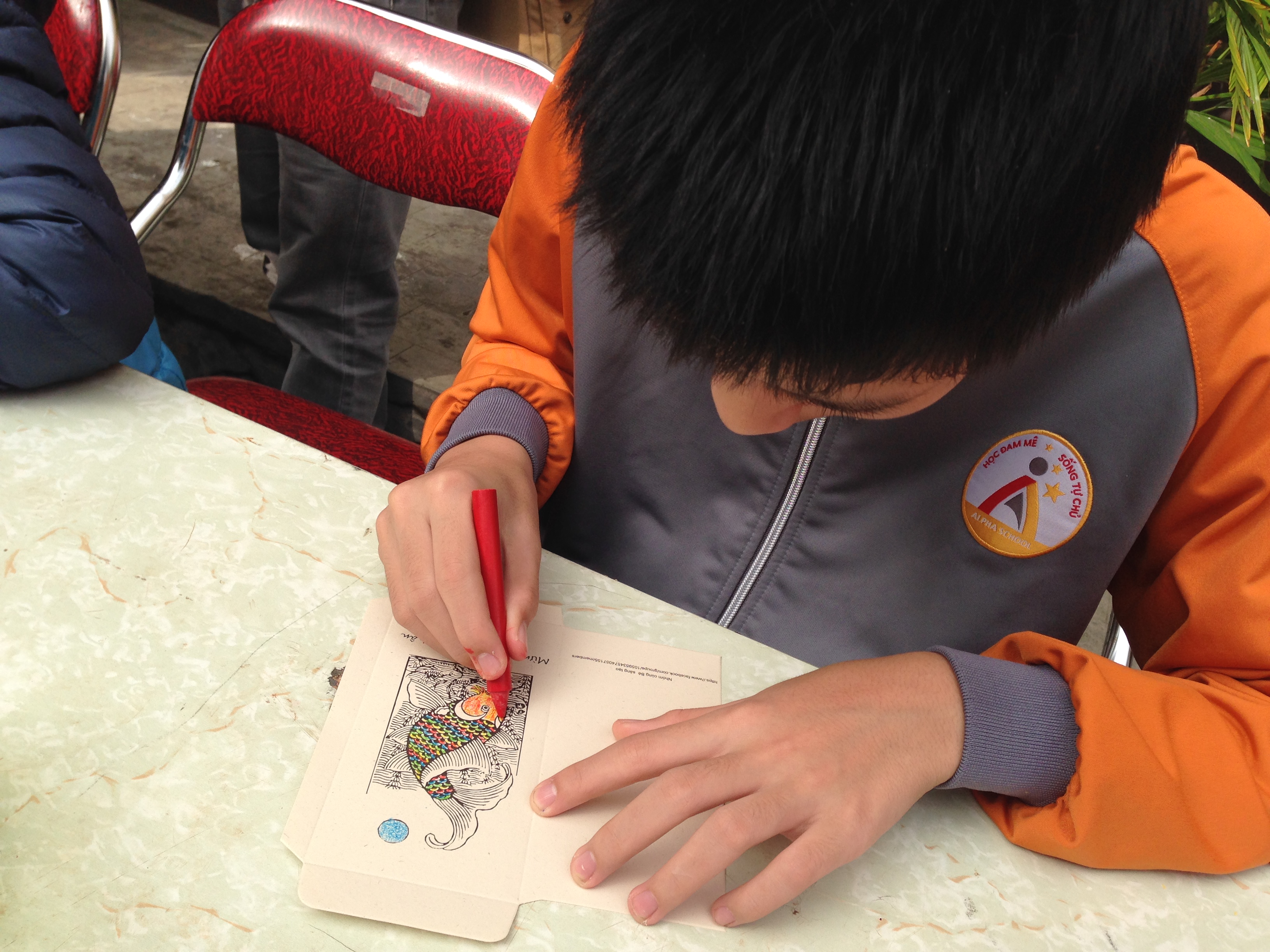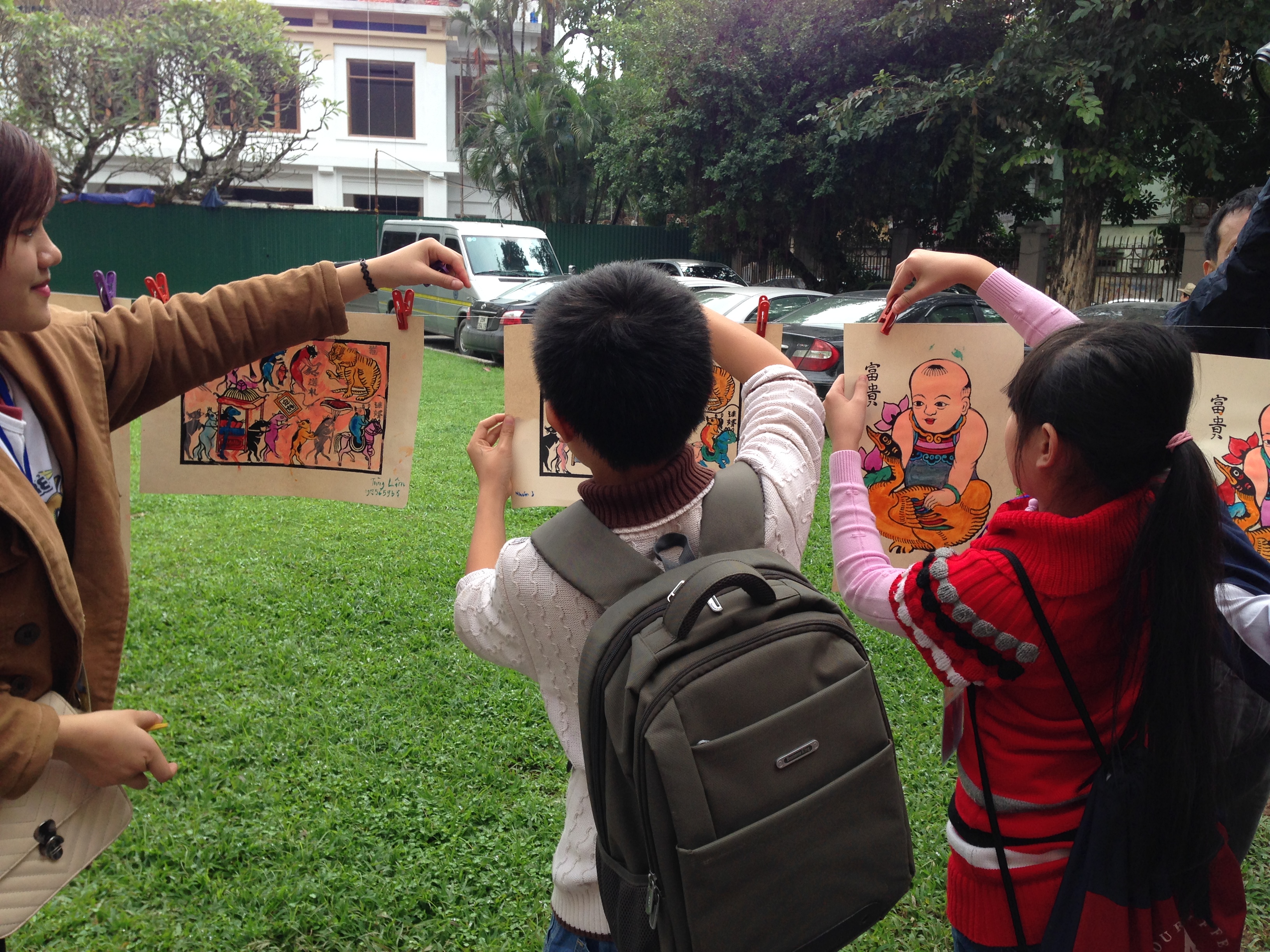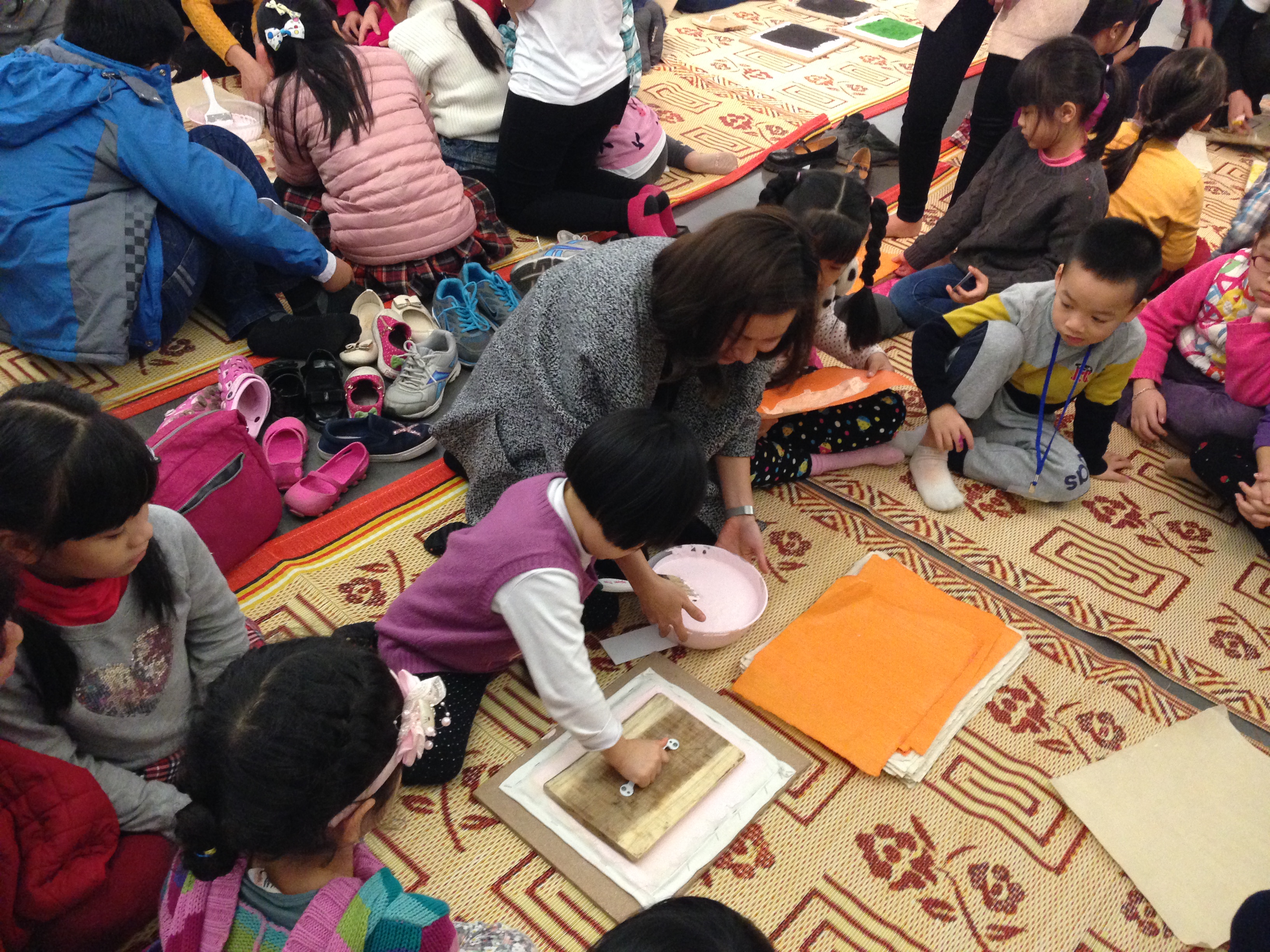 | Children learn the different skills involved in making Tet paintings, from stamping... |