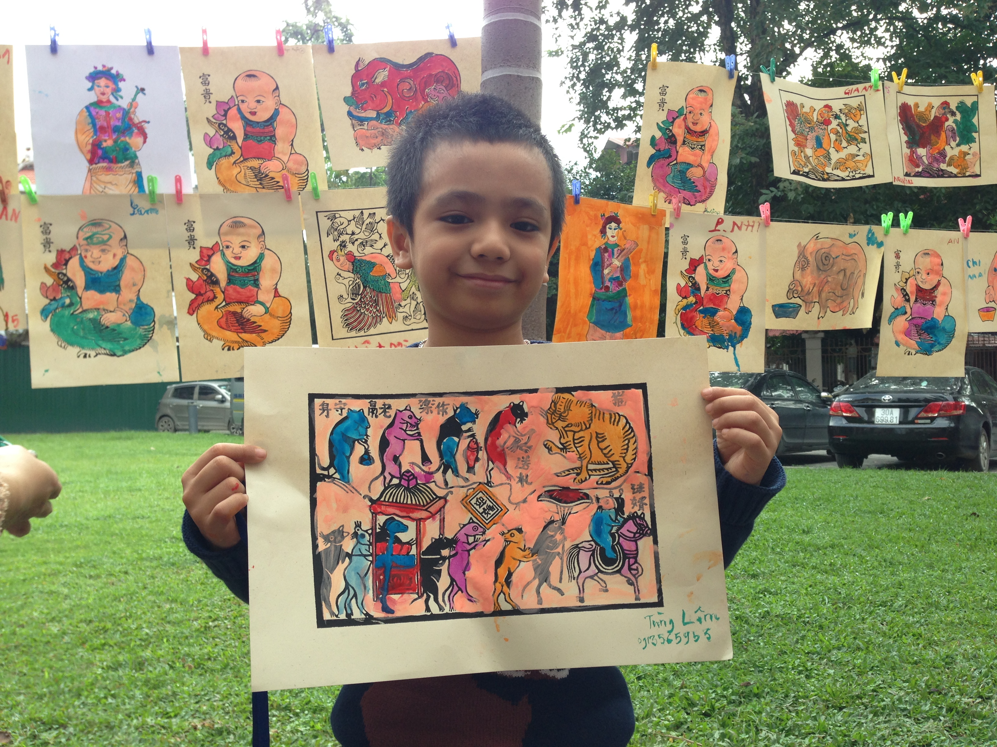| 6-year-old Nguyen Tung Lam with his completed painting, “Rat’s wedding”, conveying a wish for a peaceful life. |