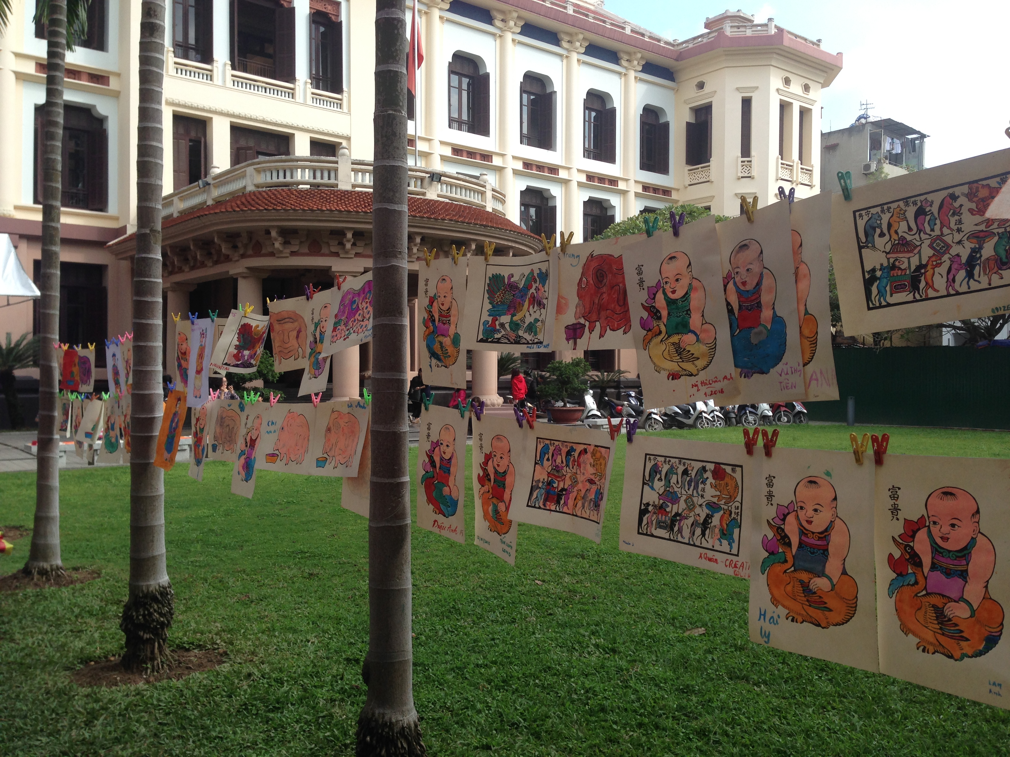 | Hanging paintings to dry. |