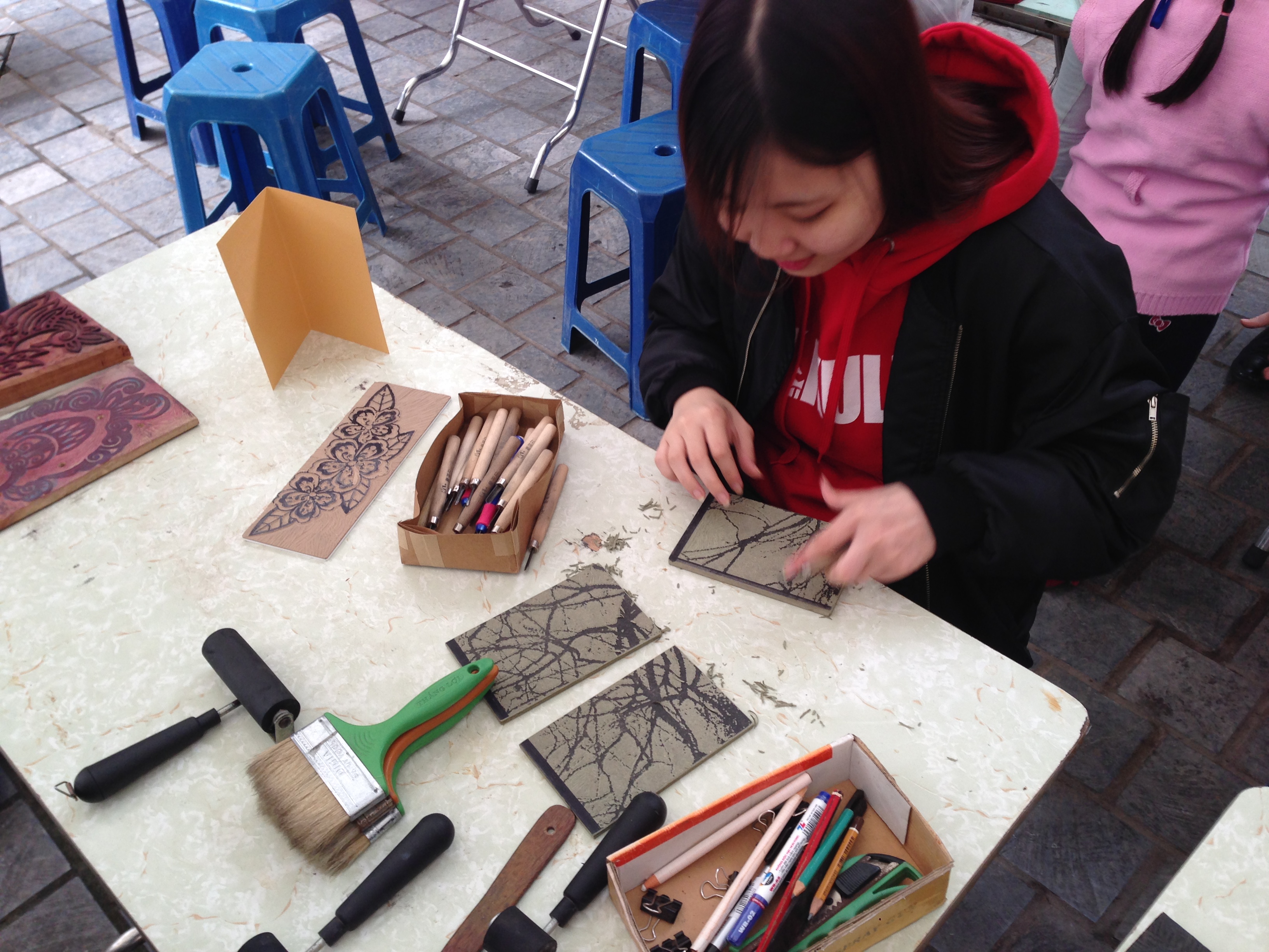 | Preparing wood blocks for printing. |