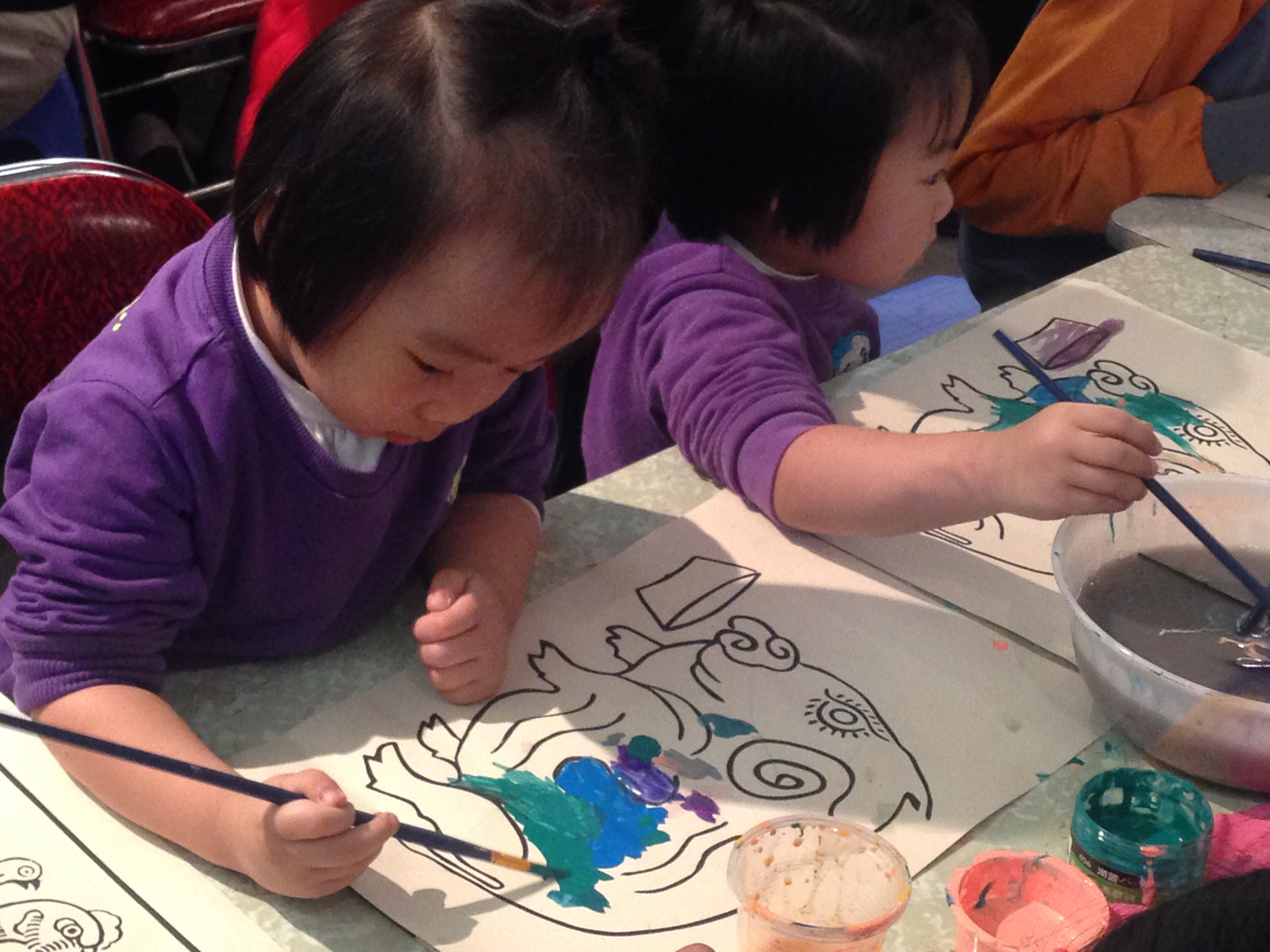 | 3-year-old twins Ha Linh and Minh Hang get hands-on experience in water-coloring. |