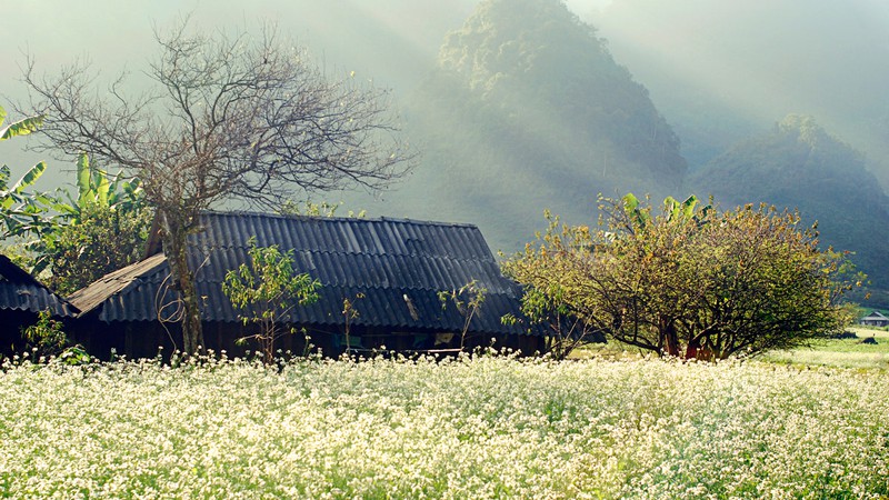 Spring is the best time to come and admire the white mustard green flowers blooming beautifully along a valley in Moc Chau.