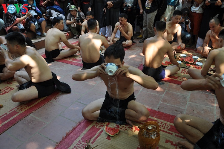 Wrestlers of competing teams perform a traditional ritual in front of the temple, in which they drink wine to boost their strength and spirit