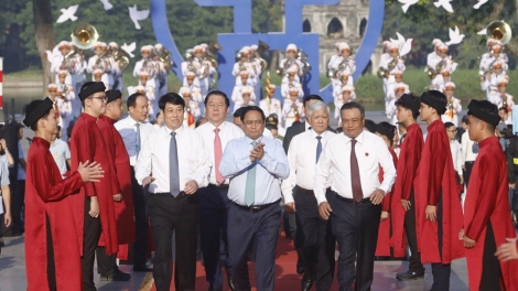 (VOVWORLD) - 10日午前、ハノイの国家会議センターで、党中央委員会、国会、国家主席、政府、ベトナム祖国戦線中央委員会、およびハノイ市の行政府は共同で首都ハノイ解放70周年を記念する国家レベルの式典を行い、トー・ラム党書記長・国家主席、チャン・タイン・マン国会議長、ハノイ市の指導者、および知識人、聖職者、人民各層、首都の人民武装勢力の代表多数が参加しました。
