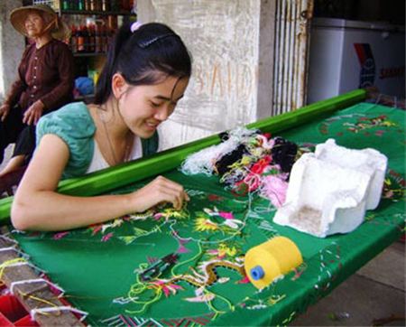 現在、バンラム村では、9つの企業と12、3の共同生産組合、そして700世帯が刺繍やレース関連の仕事に携わっています。伝統的職業村として発展しつつ、観光分野とも協力して製品のPRを進めています。チャンアンと同じく陸のハロン湾と言われている、タムコック・ビックドン地区までの道の両側には、刺繍製品店が軒を連ねています。