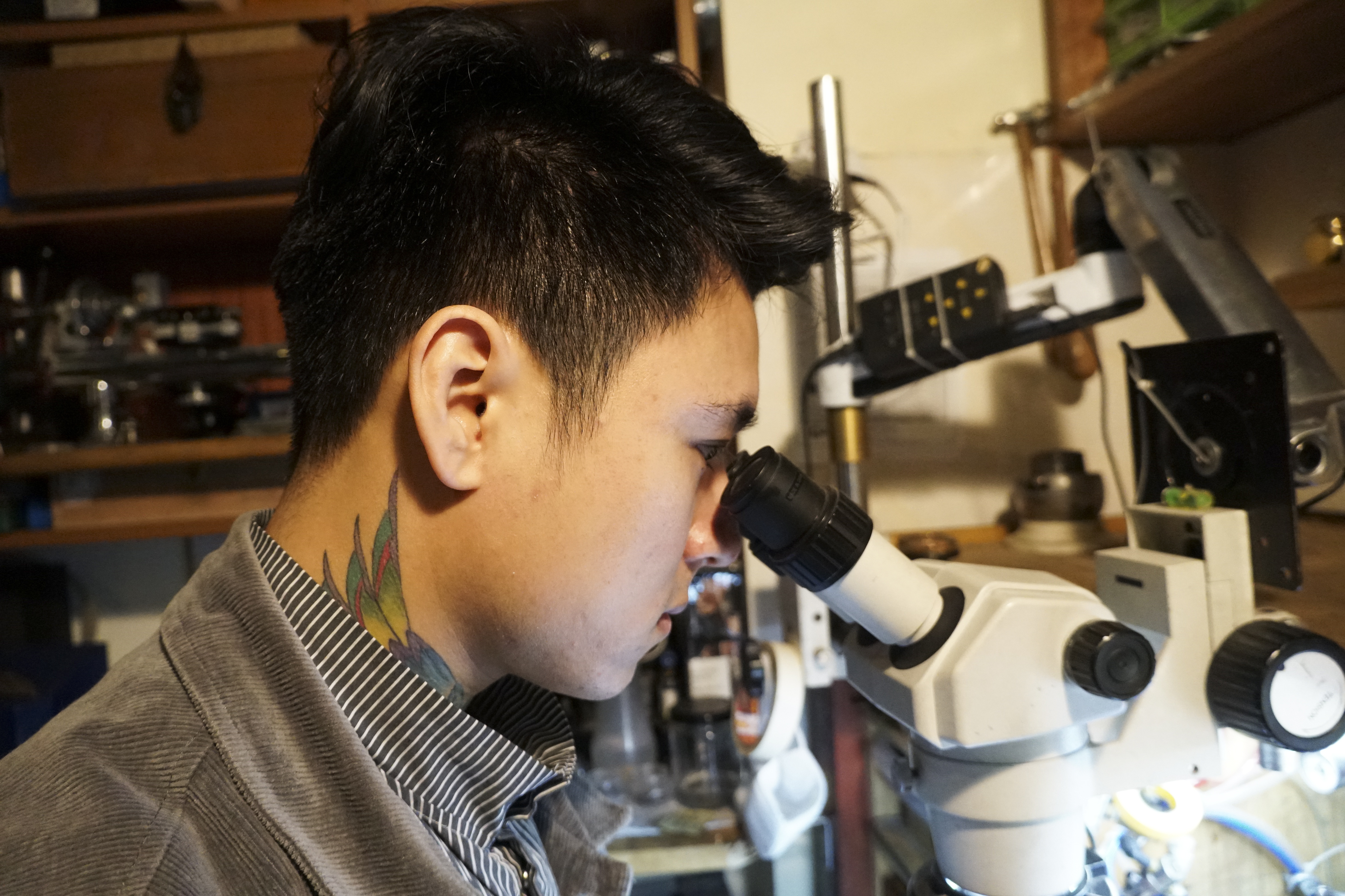 「私は毎日、この場所に座って、顕微鏡を通して、彫っています。繰り返し作業みたいですが、実は、それぞれの工程やそれぞれの製品は異なる感情があります。私にとって、時計への彫刻・刻印加工はつまらないものではありません。毎日、心を込めて、仕事をしています。」