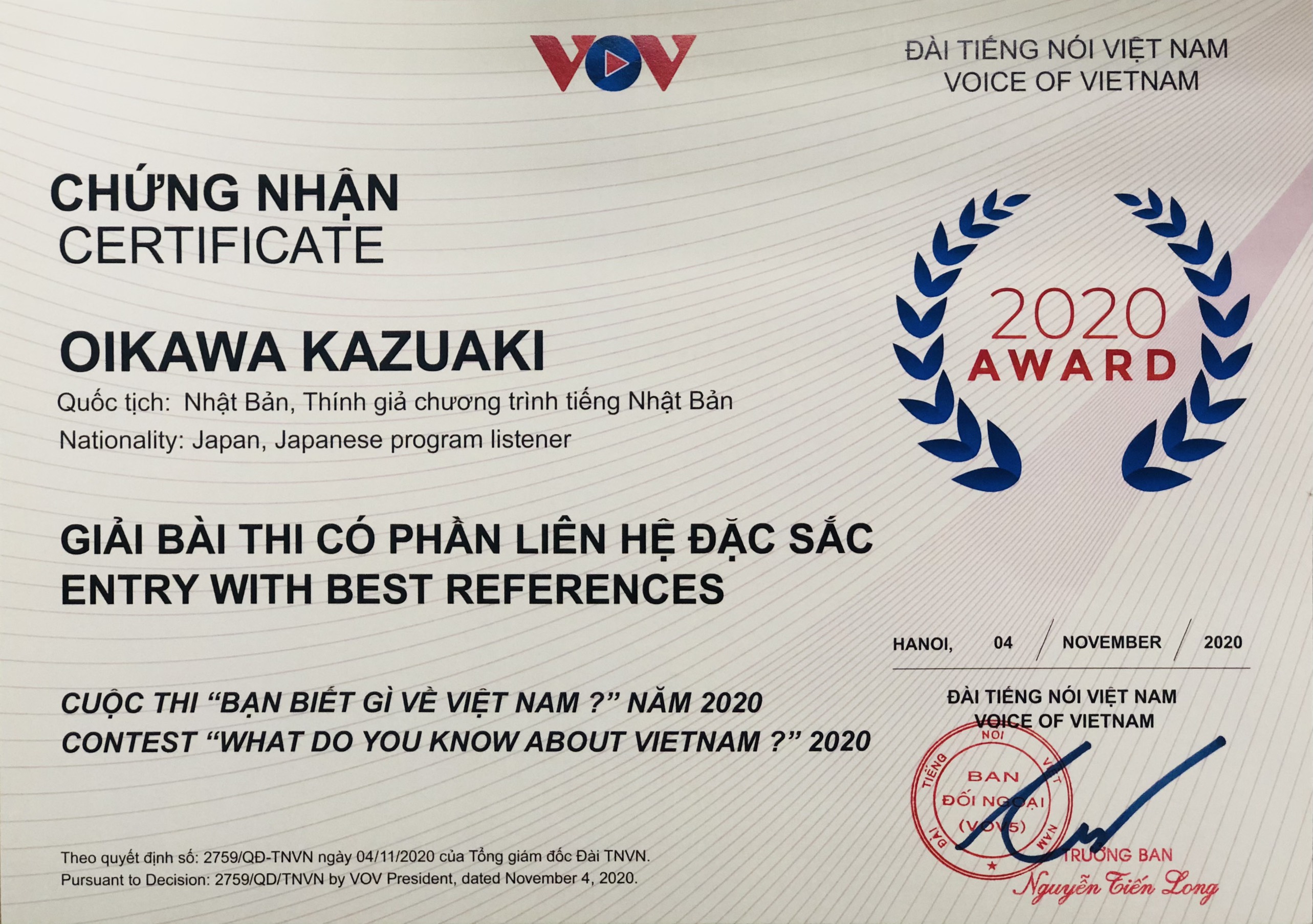 既にお伝えしましたように、VOV=ベトナムの声放送局が今年3月15日から8月31日にかけて開催した「ベトナムについて何を知っていますか」コンテストで、日本語放送のリスナー及川三晶さんは奨励賞を獲得しましたが、このほど、VOV国際放送の局長はその証明書を発行しました。