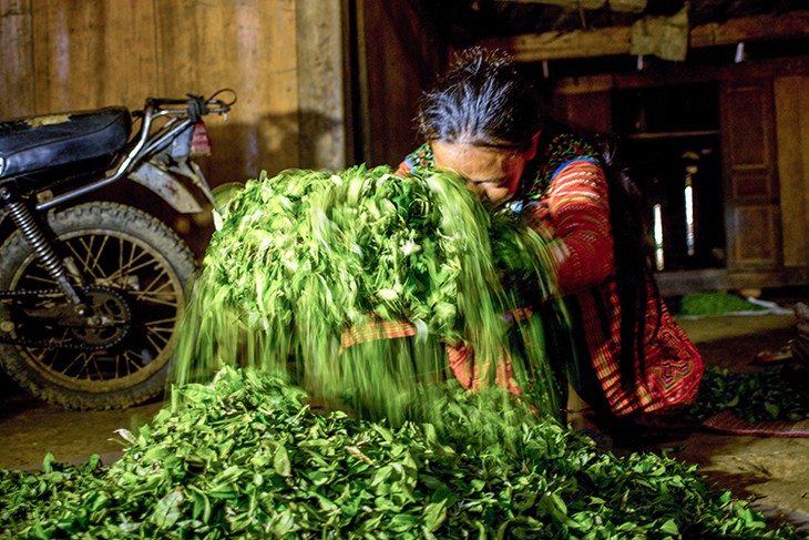 | ゆっくりしてお茶を収穫する少数民族モン族の女性(写真:VOV) |
