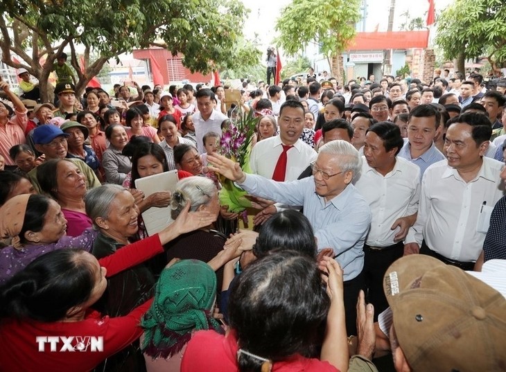 | グエン・フー・チョン書記長と北部タイビン省ティエンハイ県タイアン村の住民(写真:Trí Dũng/TTXVN) |