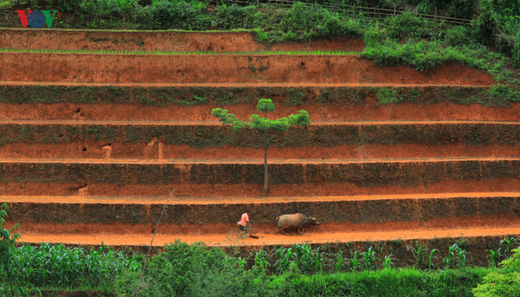 | 水不足なので、春の耕作は低いところで行われる |