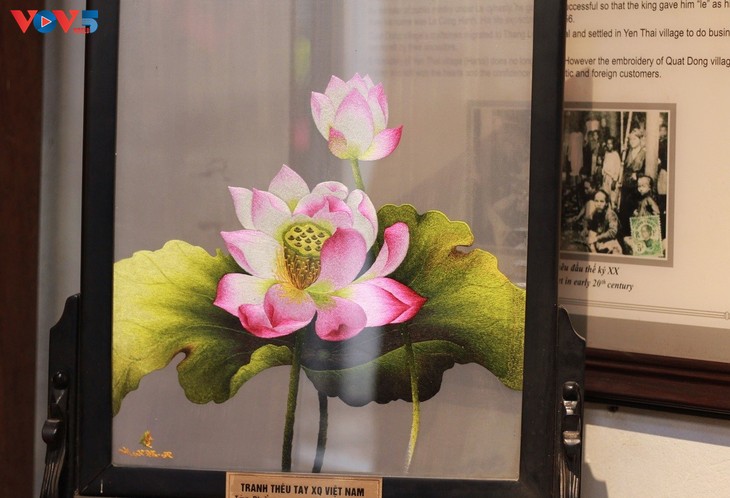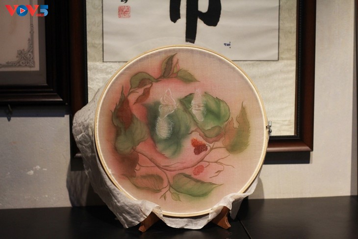 「天」を意味する円形のフレームにつける刺繍職業で有名なクアットドン村の職人の絹絵