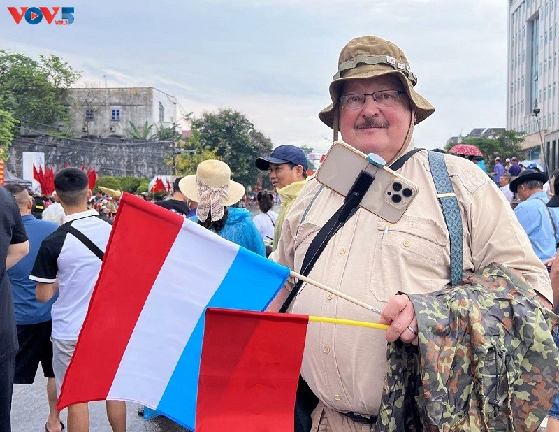 パレードを見に来た人々の中に、ベトナムとルクセンブルクの国旗を手にしていたルクセンブルクからの観光客ローランド・ガウルさんと友達はベトナムの歴史に興味を持って、ディエンビエンフー作戦の勝利をよく理解しているので、ベトナムには10回、ディエンビエンフー市には5回訪れました。