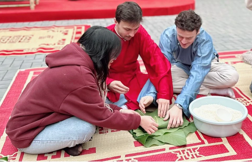 外国人留学生がベトナム風チマキ「バインチュン」作りを体験(写真:Vietnam+)