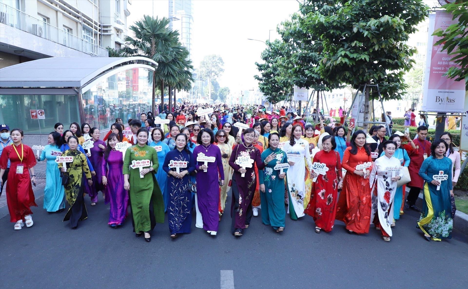 ホーチミン市の女性たちが伝統衣装アオザイを身にまとい、行進に参加(写真:Thu Hương/TTXVN)